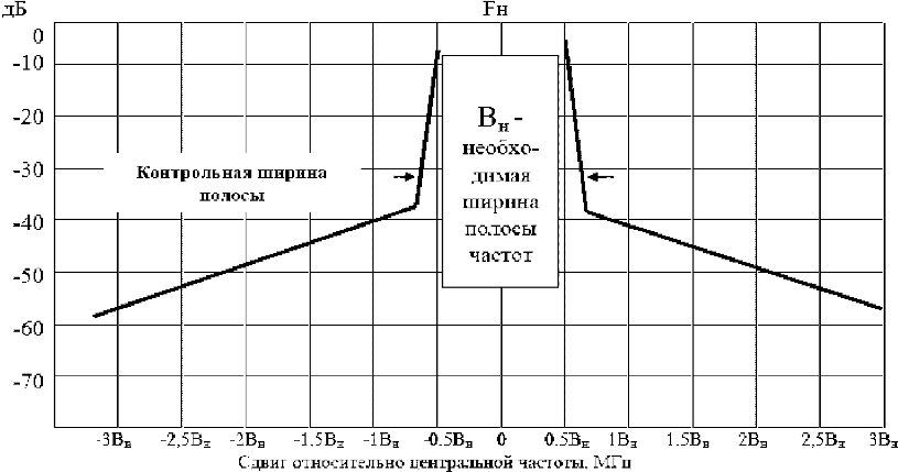 2.5 Контрольная ширина полосы частот излучения: полоса частот излучения радиопередающего устройства на уровне -30 дБ, за пределами которой любая дискретная составляющая спектра внеполосных радиоизлучений или спектральная плотность мощности внеполосных радиоизлучений ослаблены не менее, чем на 30 дБ относительно заданного (исходного) уровня 0 дБ.