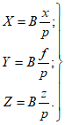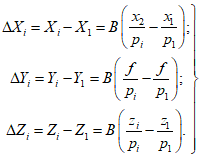 По результатам этих измерений, исправленными поправками за уклонения элементов внешнего ориентирования от заданных (для нормального случая съемки) значений, вычисляют пространственные фотограмметрические координаты X, Y и Z сфотографированных точек: