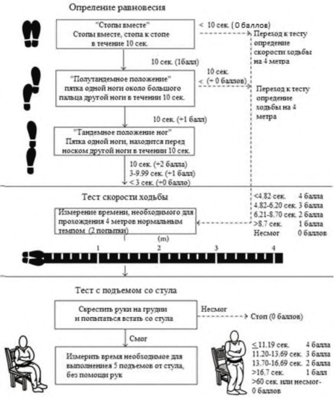 Первая попытка пробная. Во время второй и третьей попытки измеряется время в секундах, за которое пациент проходит 4 метра. Учитывается лучший результат.