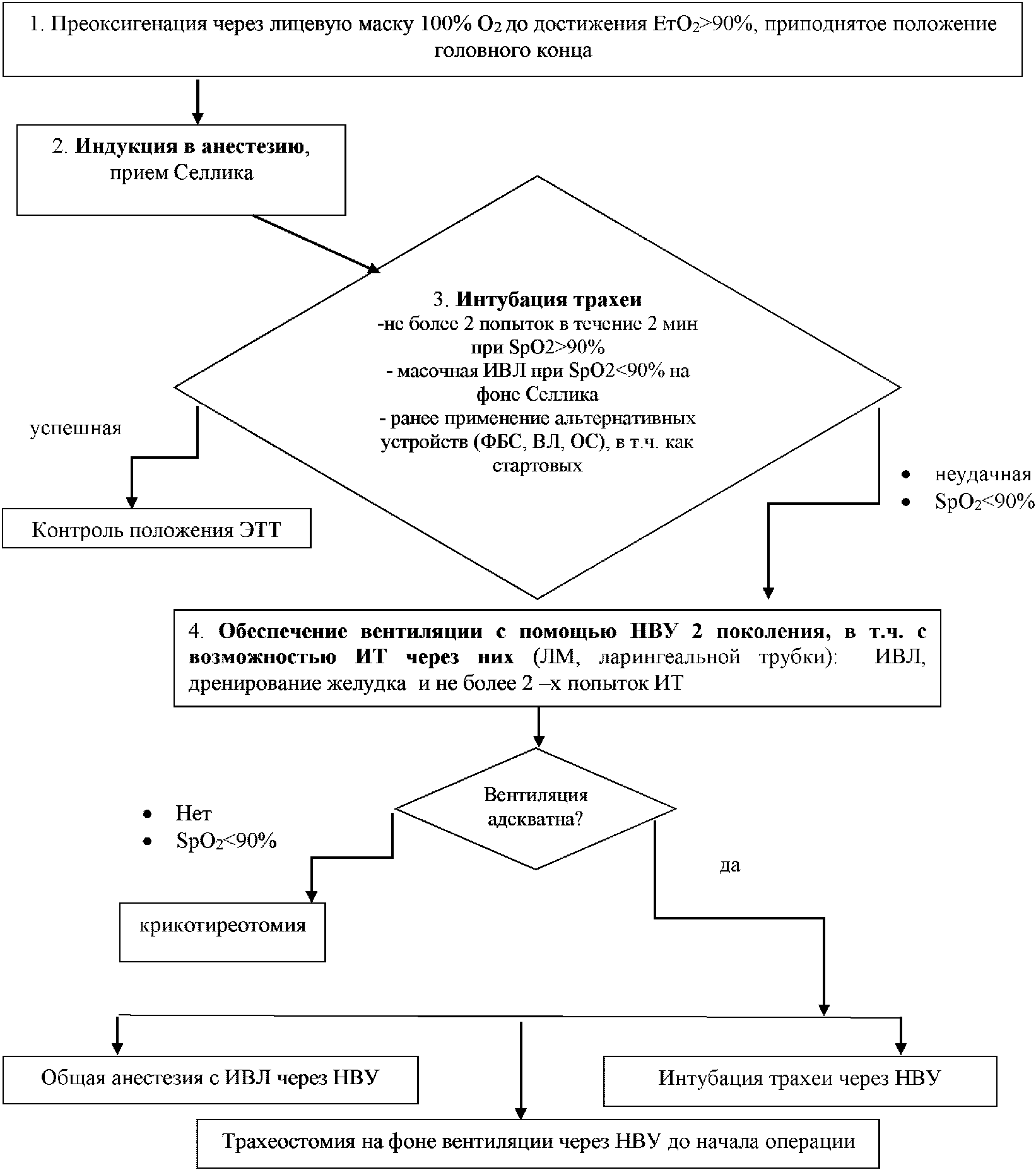 Основной план интубации:  введение препаратов последовательно в течение минуты  проведение масочной вентиляции до интубации  установка орофарингеального воздуховода  не более 2 попыток прямой ларингоскопии | Резервный план после 2-х неудачных попыток прямой ларингоскопии и интубации:  вызов эндоскописта  применение оптического стилета  применение видеоларингоскопа  масочная вентиляция до пробуждения  установка НГВ 1 поколения и проведение анестезии  установка НГВ 2 поколения и проведение анестезии  установка НГВ 1 - 2 поколения и пробуждение  установка НГВ и интубация через него вслепую  установка НГВ и интубация через него с помощью гибкого эндоскопа  крикотиреотомия  трахеостомия | Необходимый дополнительный персонал:  есть возможность вызвать коллегу  эндоскопист доступен при необходимости При необходимости крикотиреотомию выполнит:  хирург  анестезиолог |