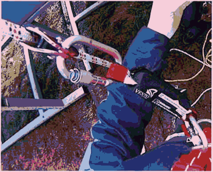 ниже грудного зажима "Кроль" заправить рабочий канат в спусковое устройство и с помощью карабина присоединить спусковое устройство в точку "В" страховочной привязи, убедившись в правильности установки спускового устройства и в его блокировке на спуск