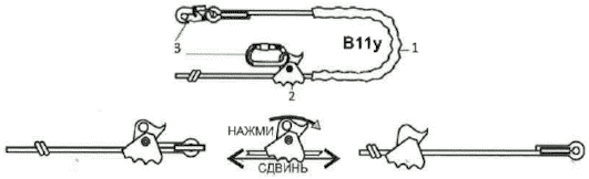 выше зажима "Кроль" на строп устанавливается ручной зажим "Жумар" с регулируемым стременем;