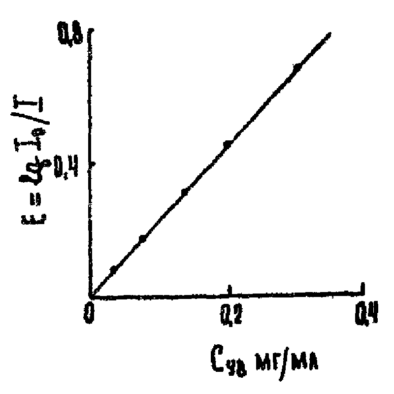 Стандартные рабочие растворы ТФФ готовят из основного раствора, разводят его в 2, 5, 10, 20, 50 и 100 раз ацетоном. Для этого в гранулированные пробирки помещают 5; 2; 1; 0,5; 0,2; 0,1 мл основного раствора ТТФ и доливает до 10 мл ацетона. Содержание пробирок тщательно перемешивают и оставляют на 5 мин. Каждая концентрация готовится в 3 - 4-х повторностях. В течение 1 ч после приготовления рабочие растворы должны быть проанализированы, при этом не следует допускать попадания на них прямых солнечных лучей. Интенсивность окраски рабочих растворов ТФФ, содержащих от 0,0025 до 0,1250 мг/мл вещества, измеряют на ФЭК с синим светофильтром, используя кювету толщиной 1 мм.