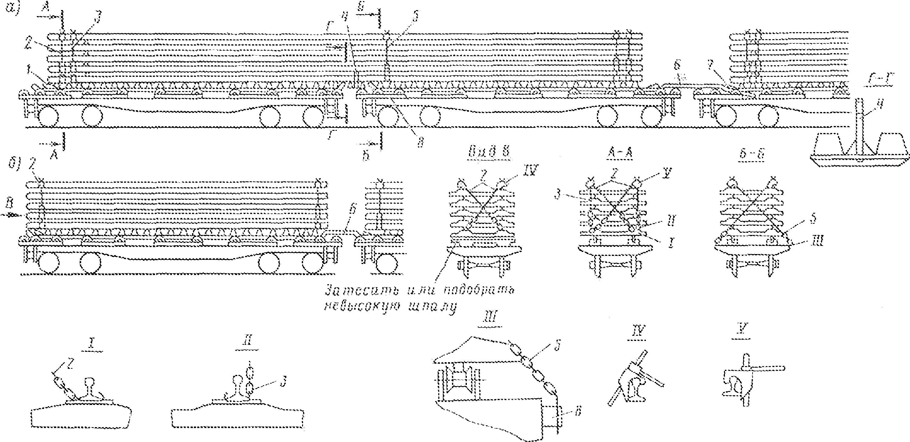 На пакетах, погруженных на лыжи, торцовые стяжки 2 и 3 крепят к подошвам рельсов нижнего звена специальной скобой (узлы I, II). На противоположном конце каждой стяжки имеется крюк (узлы IV, V), которым закрепляют ее за головку рельсов верхнего звена, и натяжная гайка для натяжения торцовых стяжек. Кроме того, пакет закрепляют за первую от центра сцепа лесную скобу (узел III), а верхний конец - за головку рельса верхнего звена (сечение Б-Б) при помощи крюка и натяжной гайки, аналогичной креплению торцовой стяжки (узел IV). Торцовые и промежуточные стяжки удерживают звенья от боковых смещений. От продольных перемещений каждый пакет закрепляют шпальными выкладками 1, установленными по обоим концам пакета. Шпальная выкладка состоит из одной шпалы, уложенной поперек платформы, и двух полушпал, уложенных вдоль платформы под шпалы нижнего звена пакета.