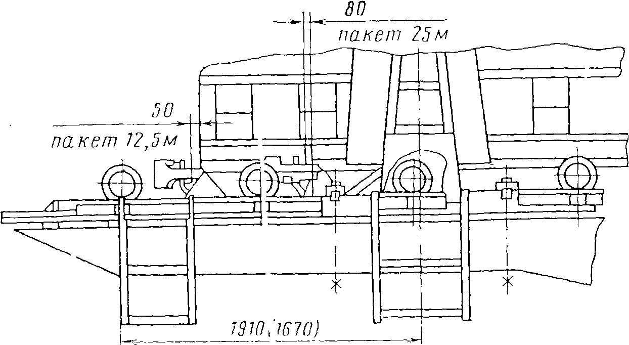 ) и съемного оборудования для перевозки пакетов 25-метровых звеньев (проект 948-000-000) каждый пакет с обоих торцов закрепляют диагональными растяжками. От продольных перемещений каждый пакет закрепляют шпальными выкладками по обоим его концам.