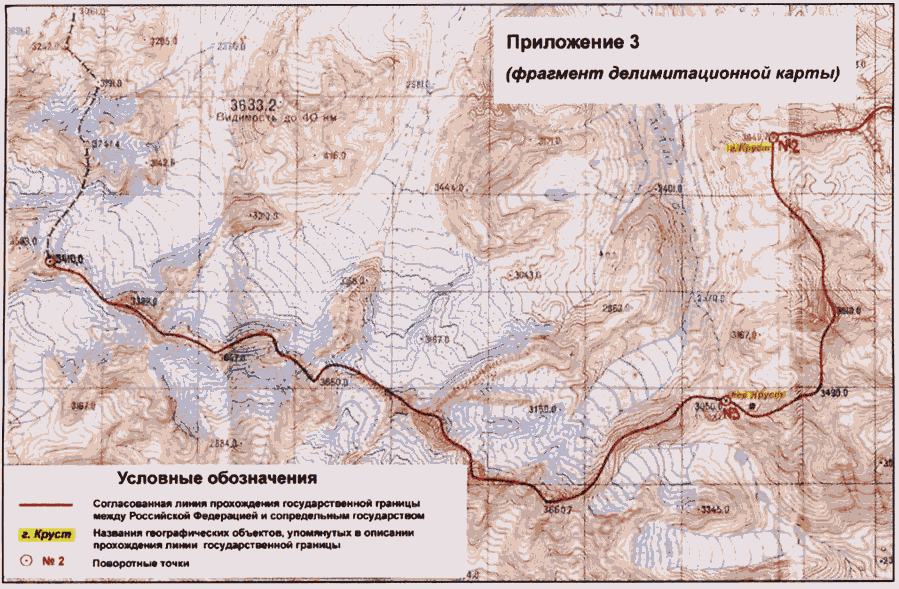 Линия государственной границы от поворотной точки N 3 идет по водоразделу упомянутого выше хребта в общем западо-юго-западном направлении примерно 4,70 км до высоты с отметкой 3460,7, затем поворачивает и идет в общем западо-северо-западном направлении примерно 12,13 км через высоты с отметками 3496,0; 3650,0; 3447,0; 3382,0 до точки стыка государственных границ Российской Федерации, Китайской Народной Республики и Республики Казахстан, Ее географические координаты: B - 49°06'54,7" с.ш., L - 87°17'09,9" в.д.