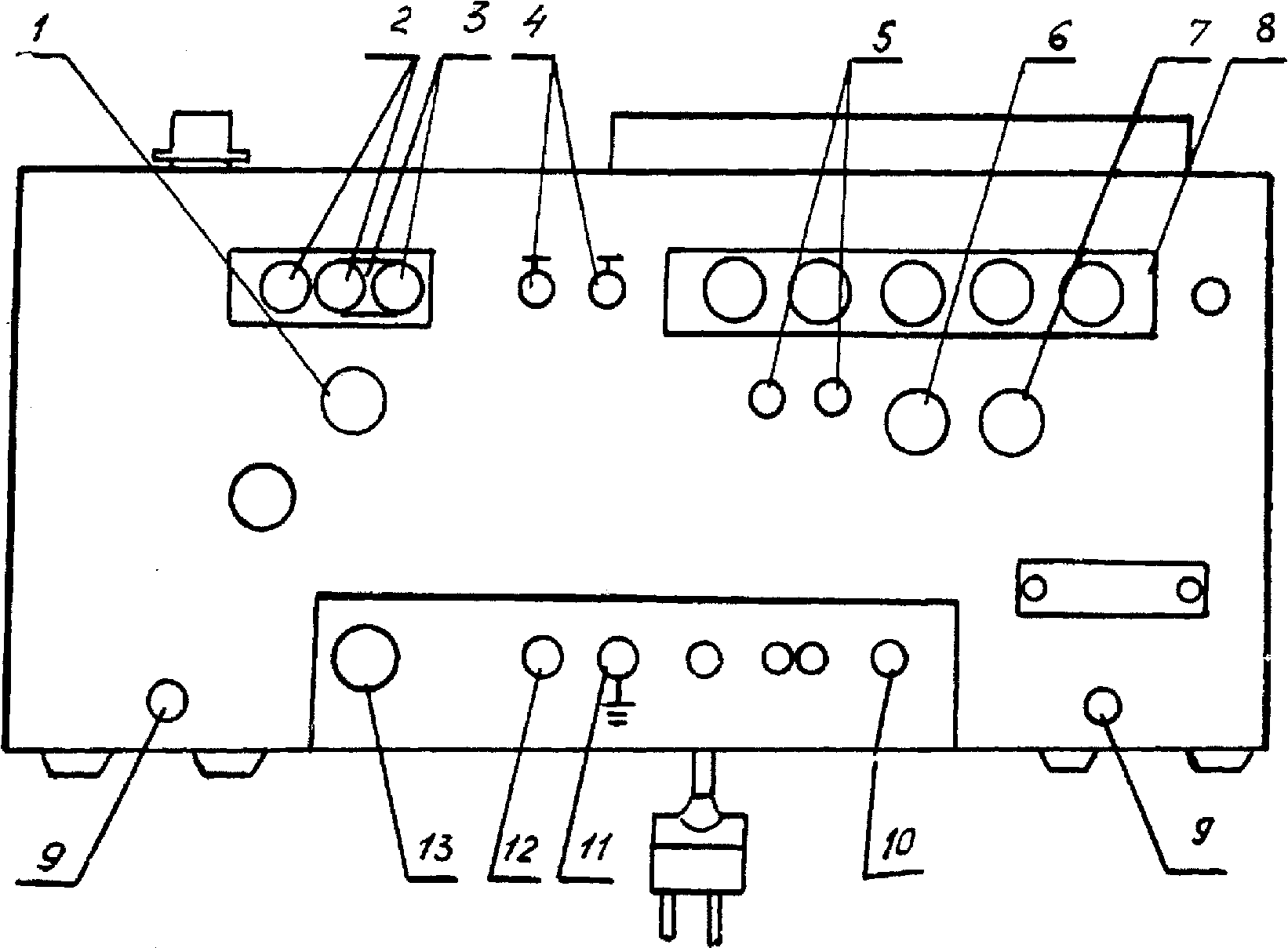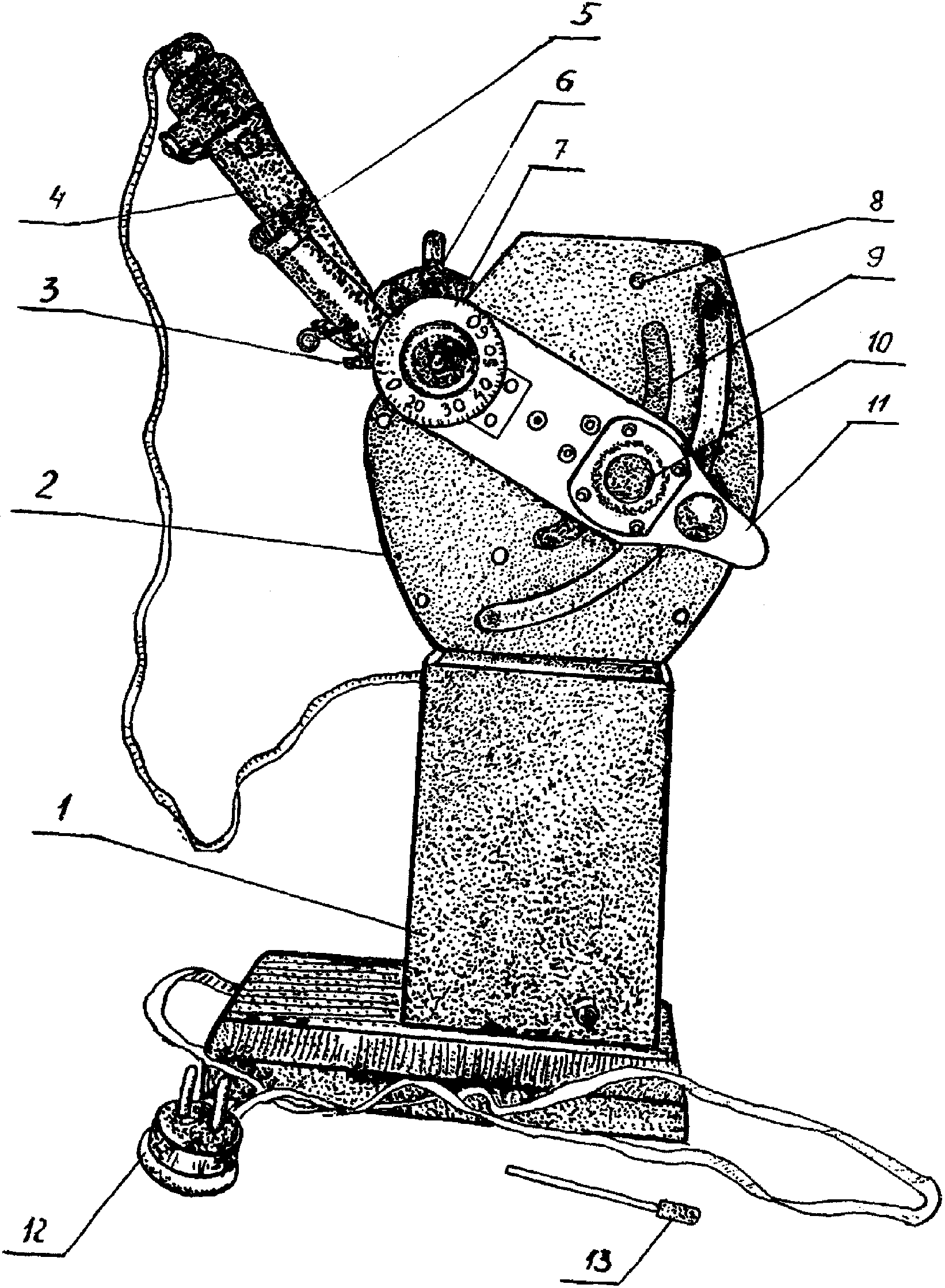 На передней части основания находится тумблер, с низа основания - предохранитель, с тыльной стороны основания - вилка разъема 11 для подключения электролампы к трансформатору и винт заземления 12.