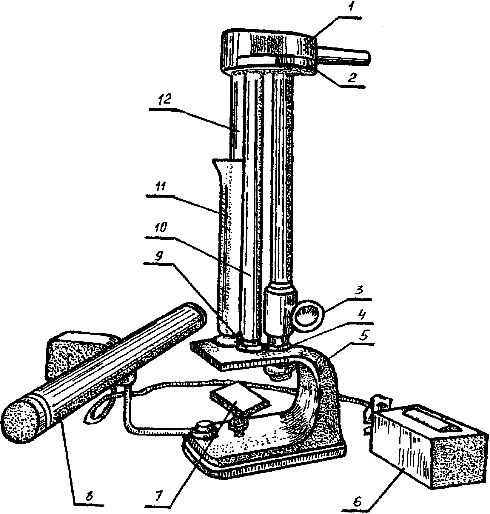 В нижней части измерительной головки расположена рукоятка 14 кремальерной передачи для перемещения подвижного кварцевого клина и связанной с ним шкалы.