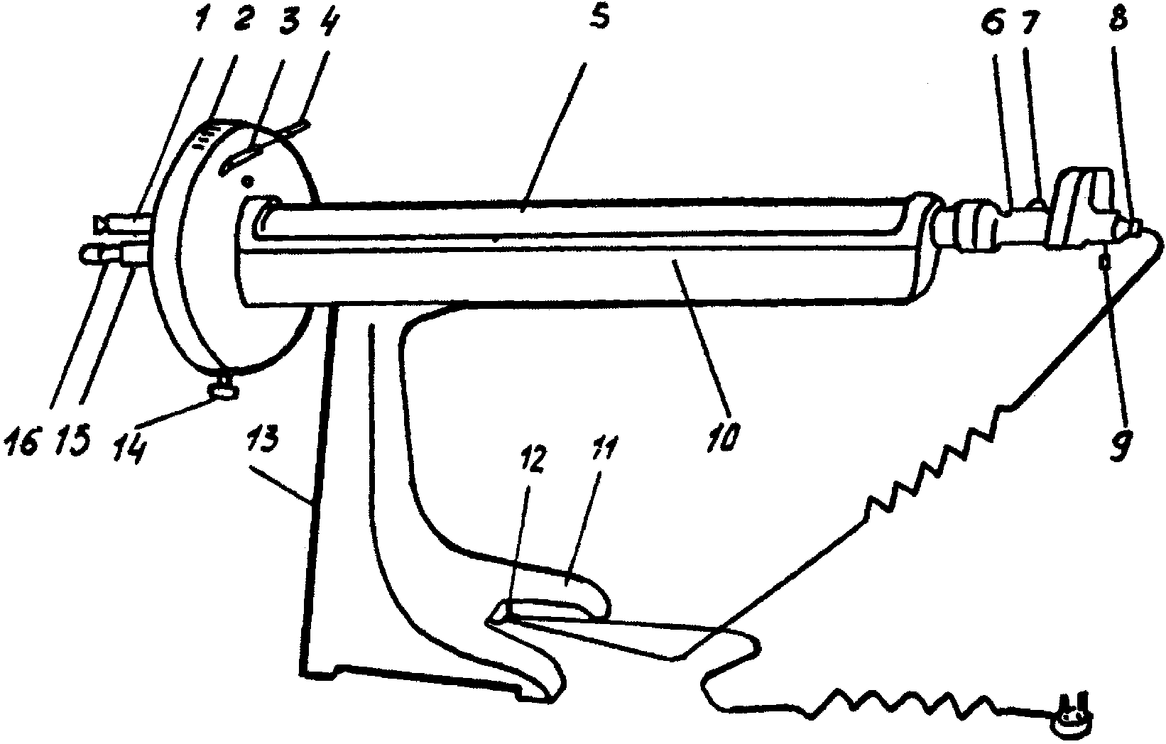 С лицевой стороны измерительной головки прибора имеются лупа 1 в оправе для отсчета показаний по шкале и зрительная труба 16. В зрительной трубе находится гильза 15 с анализатором, снимающаяся при установке поля зрения на однородность. С тыльной стороны измерительной головки находится винт 3 для установки шкалы прибора на нуль с помощью съемного ключа 4.