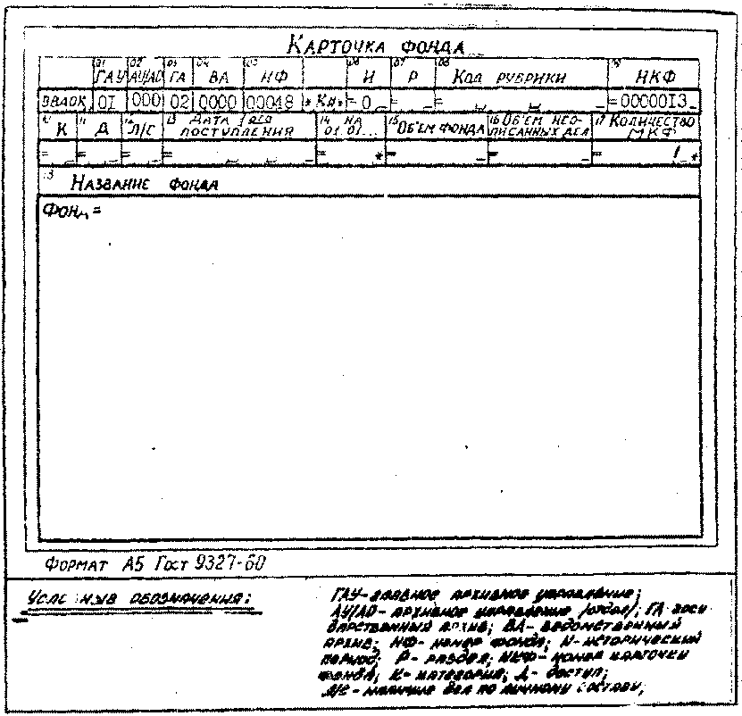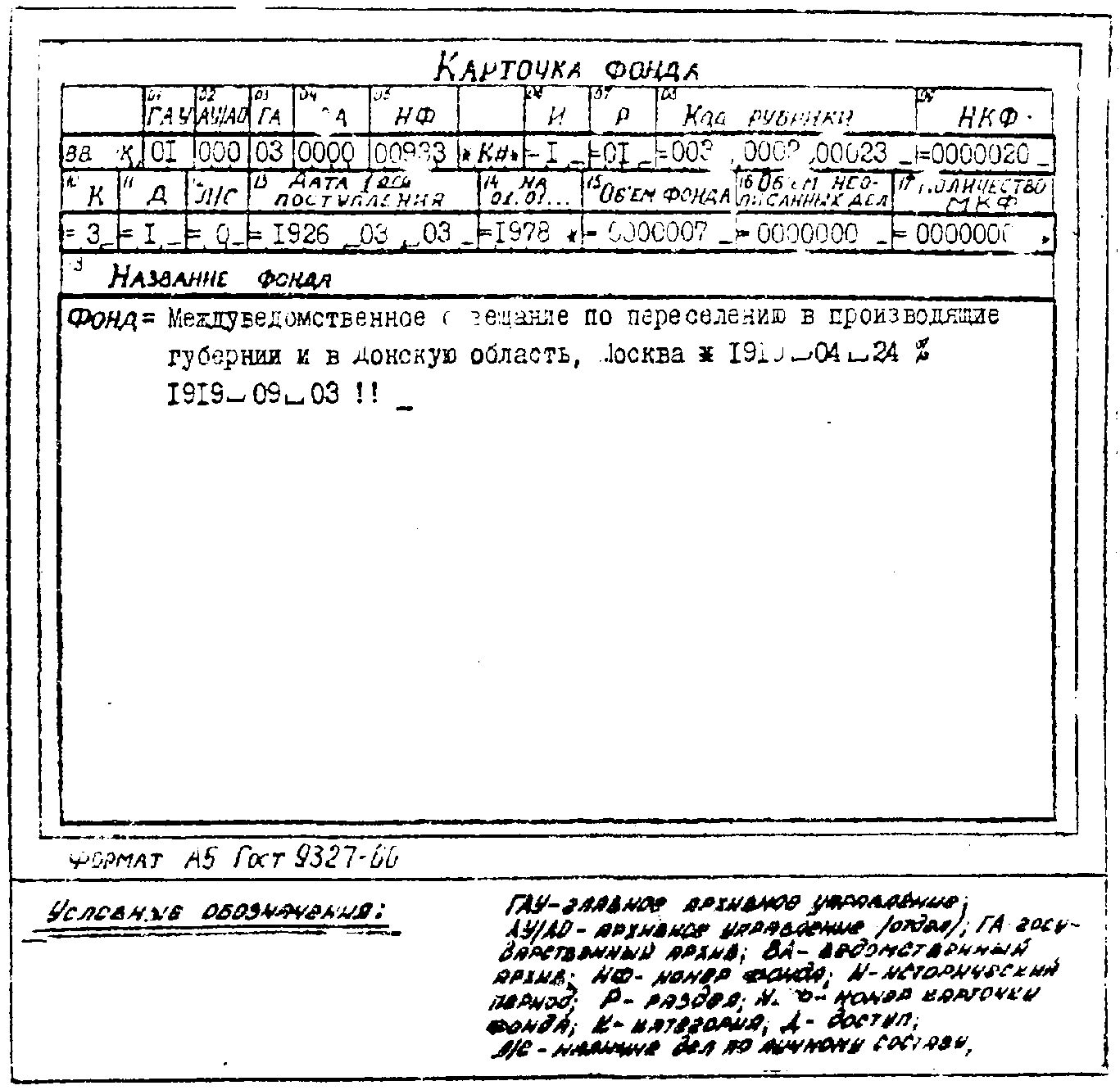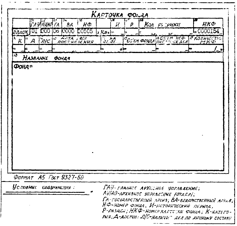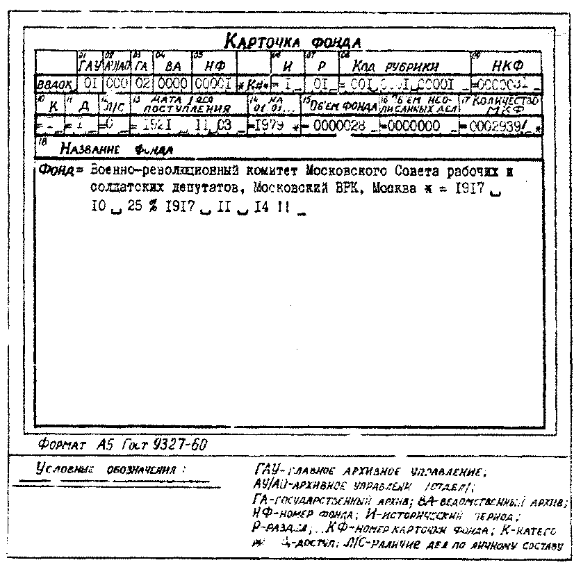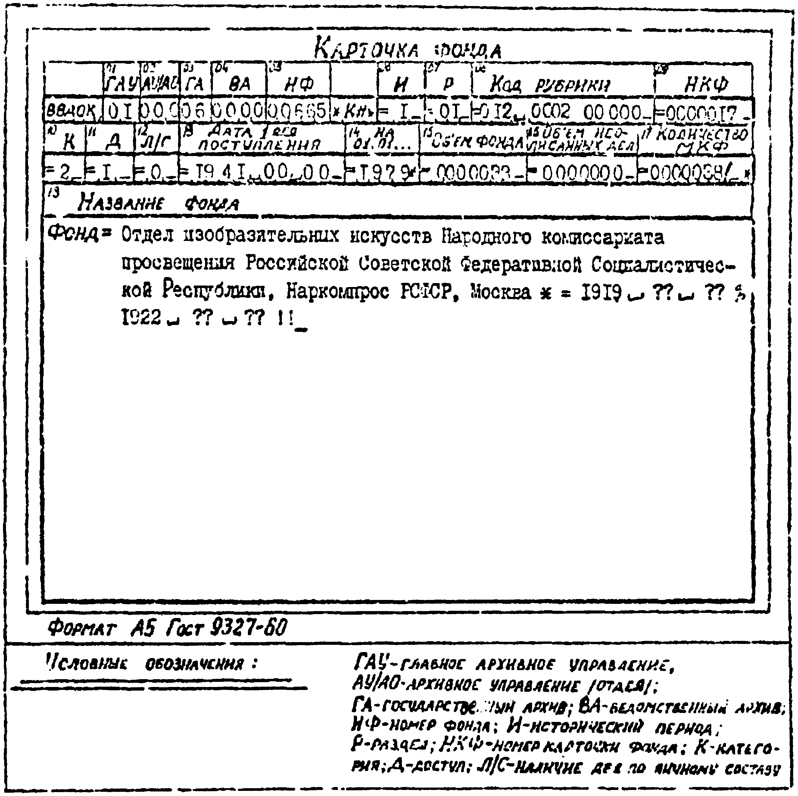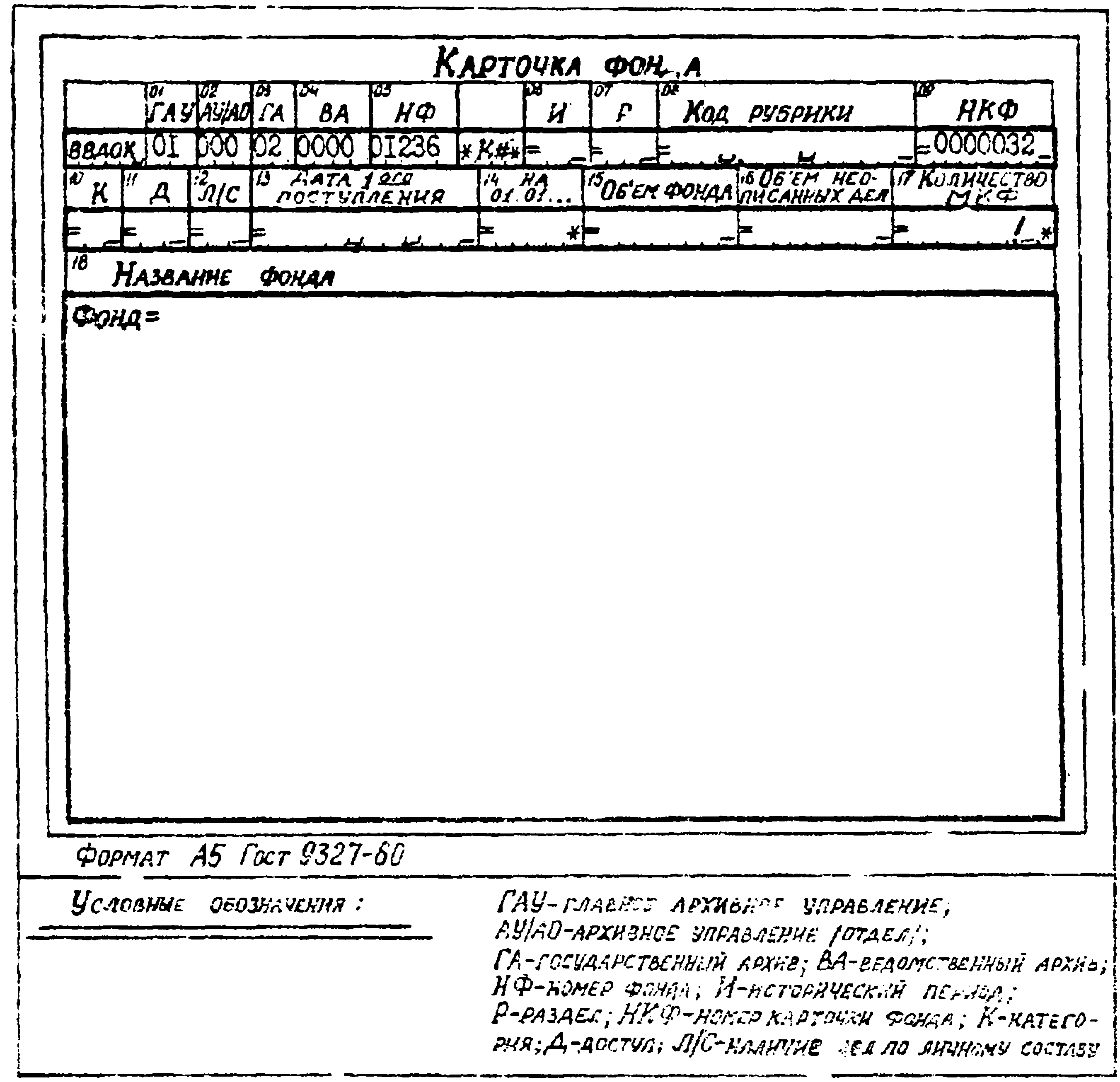 2.3.1. Карточка фонда содержит 27 реквизитов и заполняется в два приема: децентрализованно - в ведомственных и государственных архивах и централизованно - в соответствующих подразделениях АСНТИ по документам ГАФ СССР.