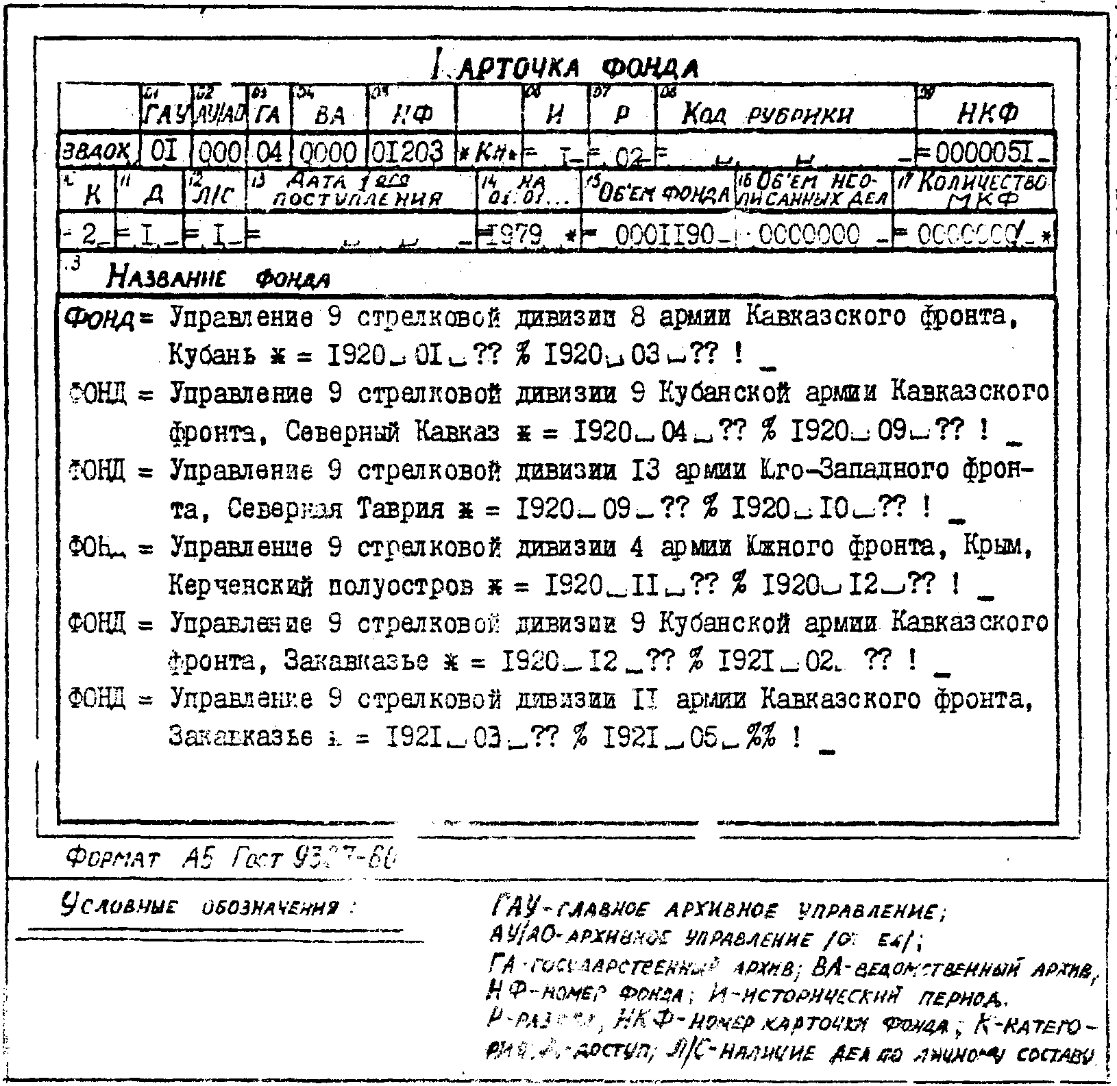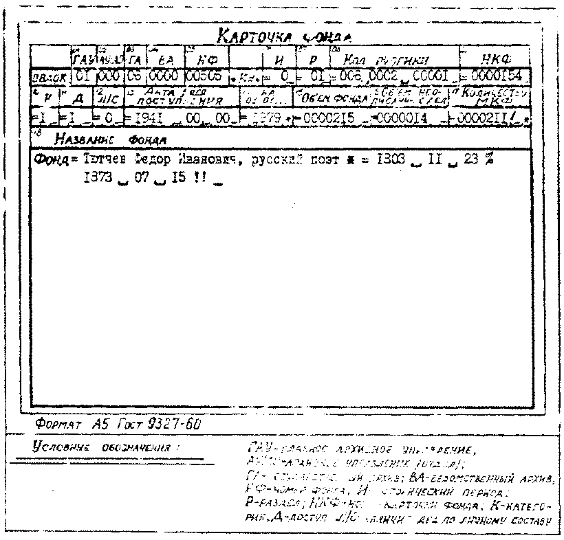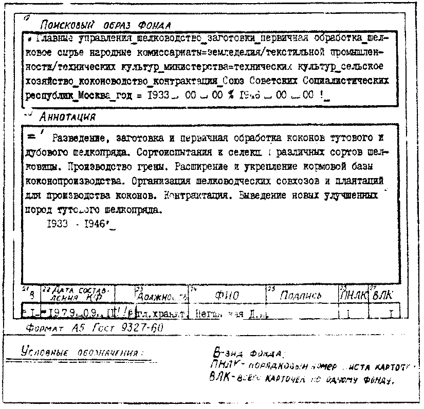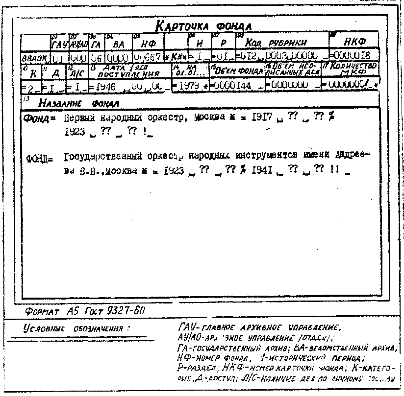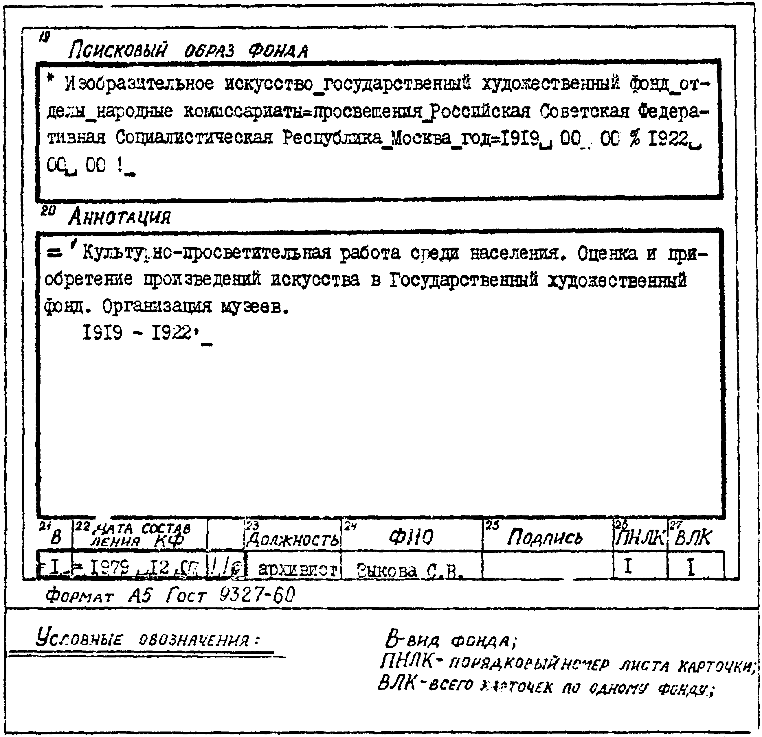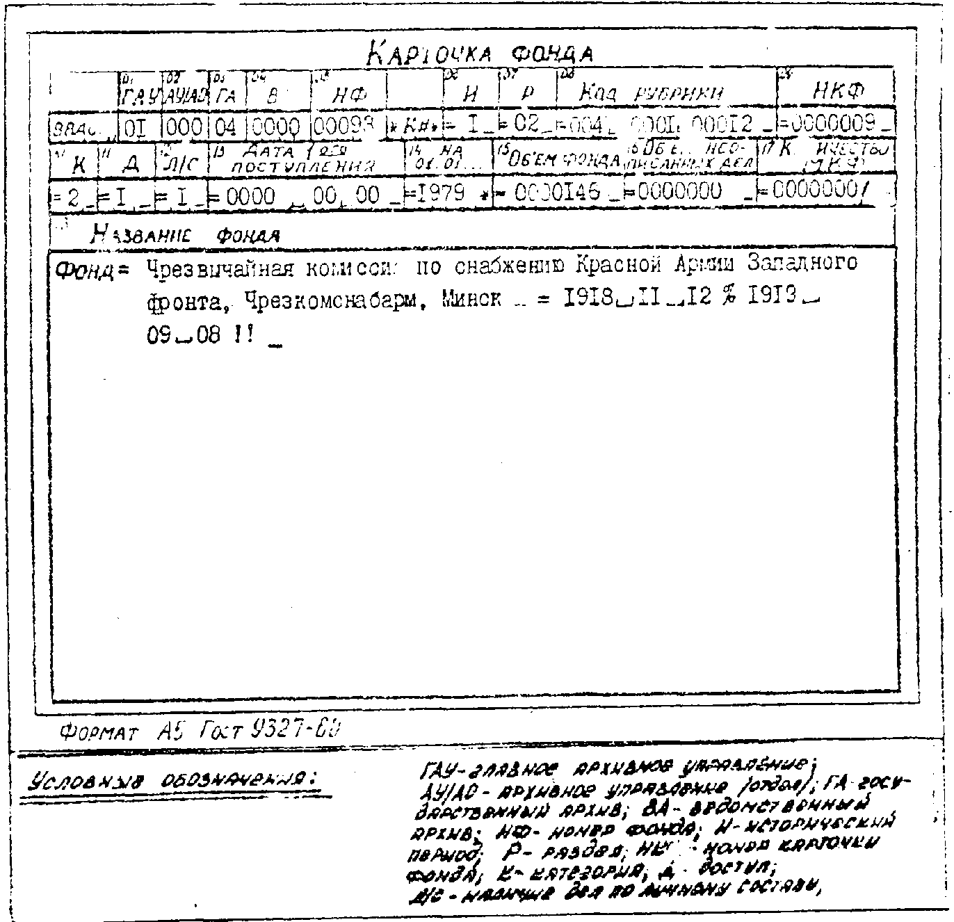 2.3.1. Карточка фонда содержит 27 реквизитов и заполняется в два приема: децентрализованно - в ведомственных и государственных архивах и централизованно - в соответствующих подразделениях АСНТИ по документам ГАФ СССР.
