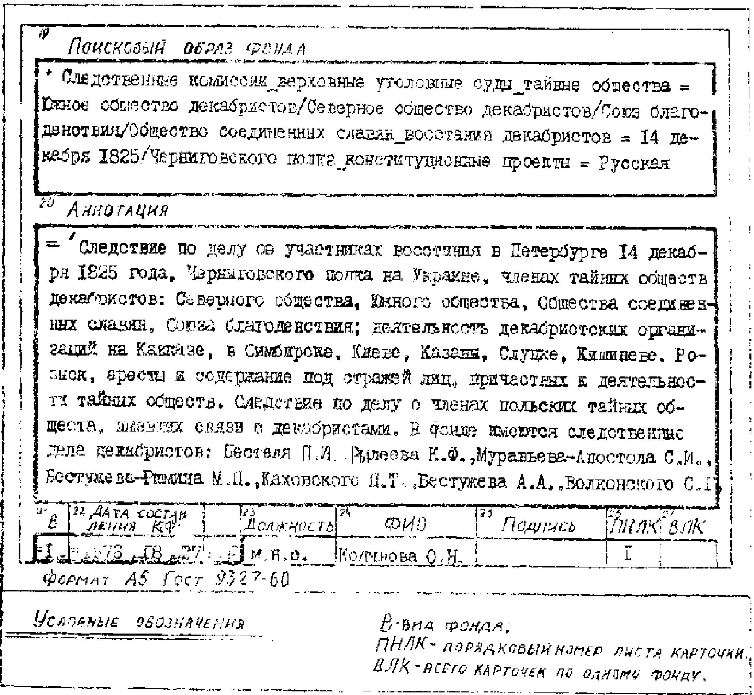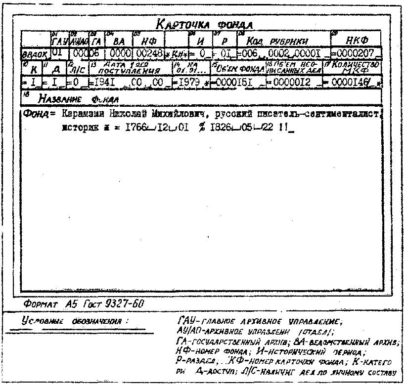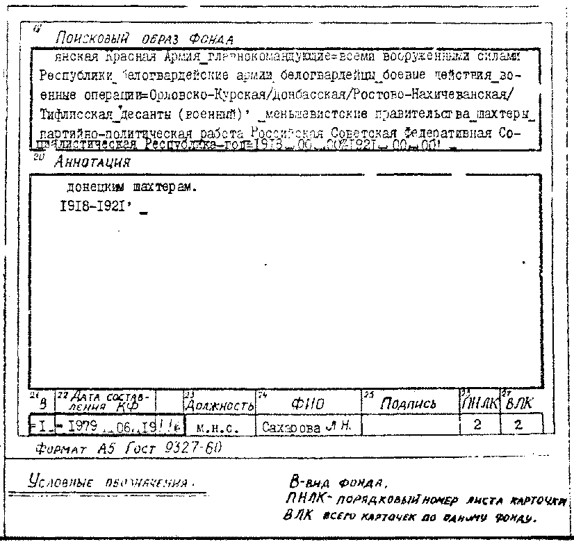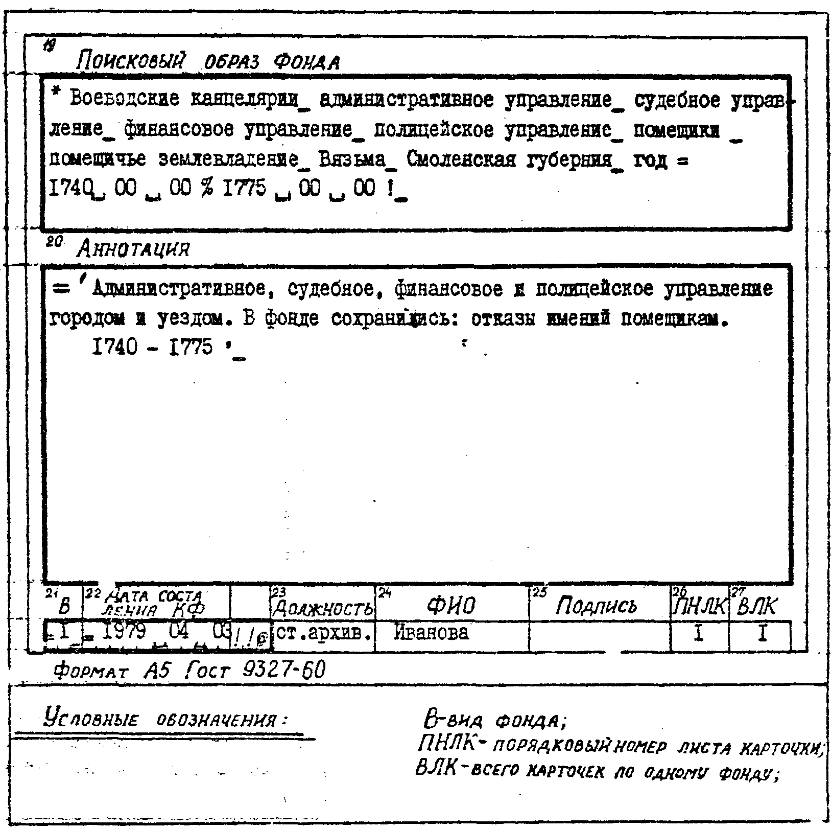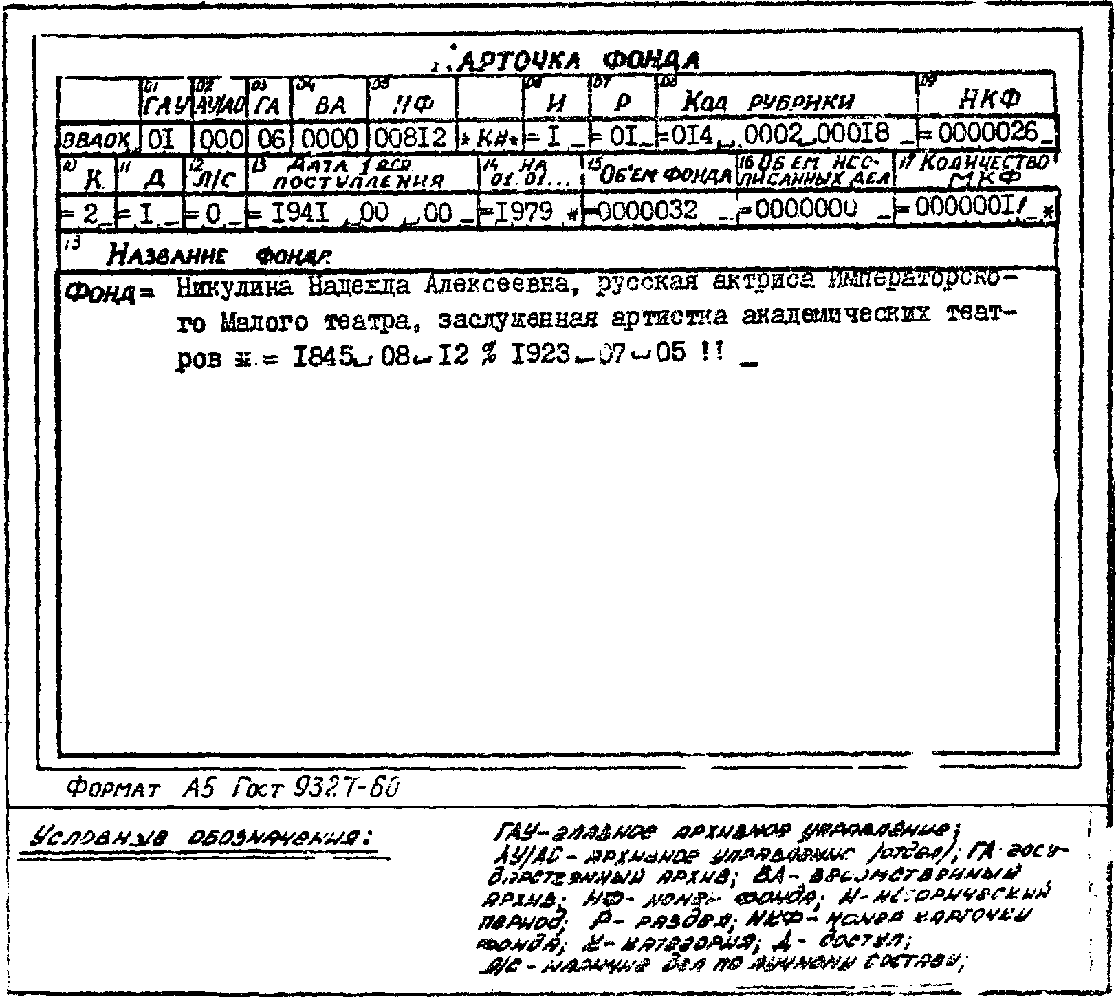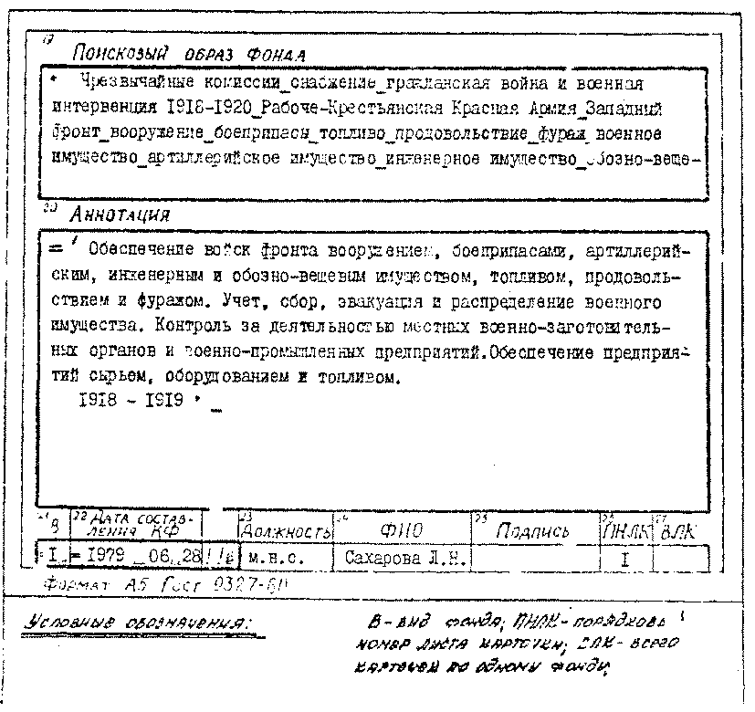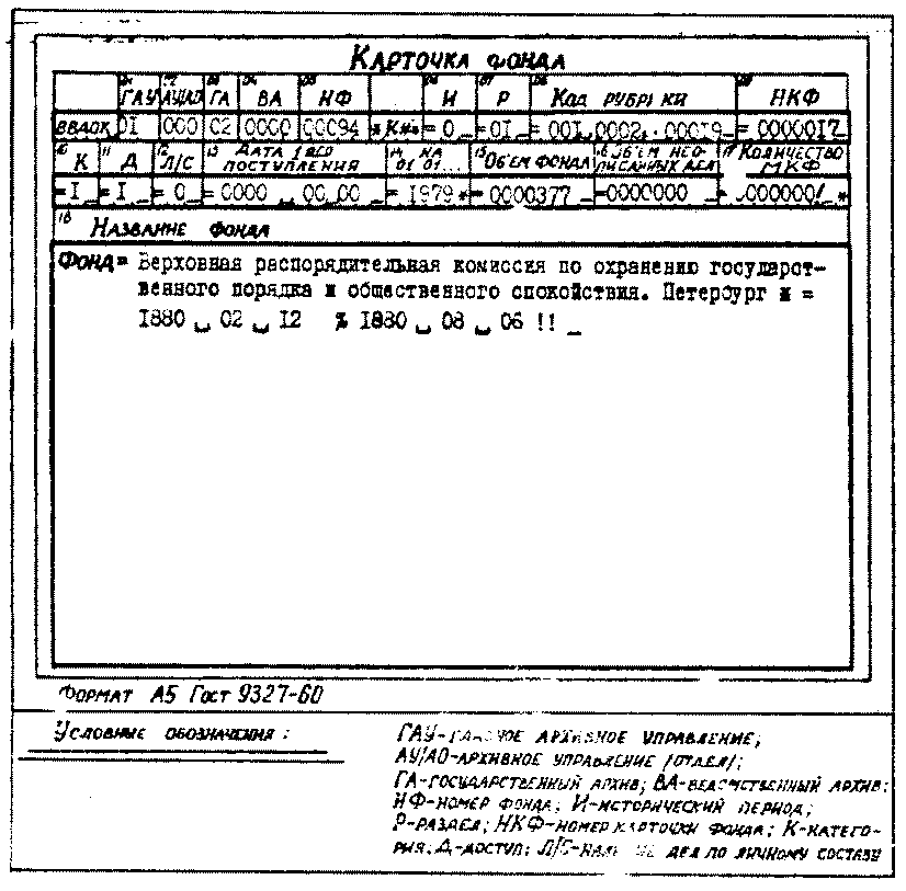 2.3.1. Карточка фонда содержит 27 реквизитов и заполняется в два приема: децентрализованно - в ведомственных и государственных архивах и централизованно - в соответствующих подразделениях АСНТИ по документам ГАФ СССР.