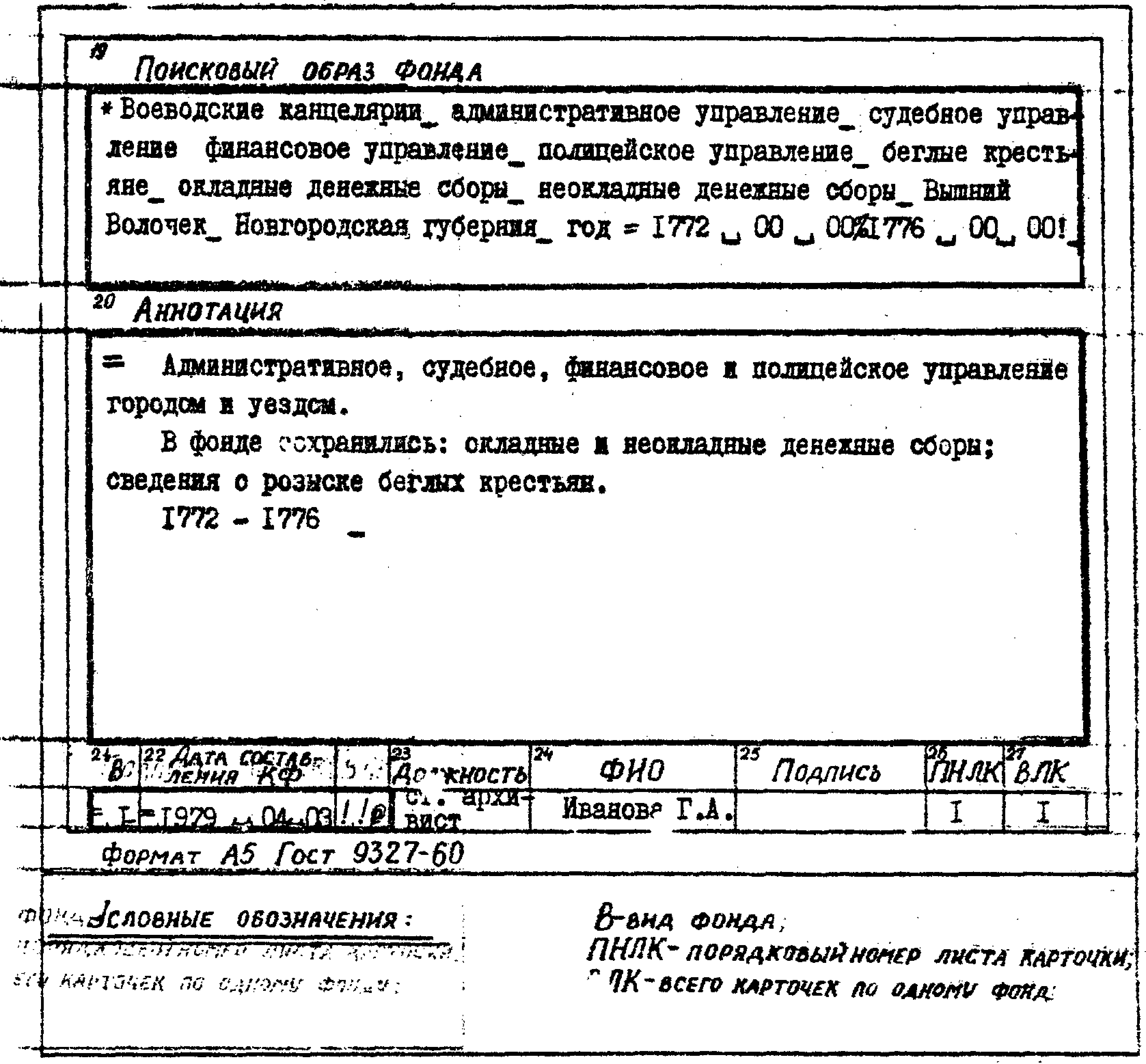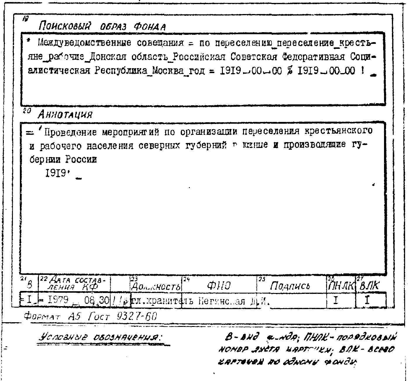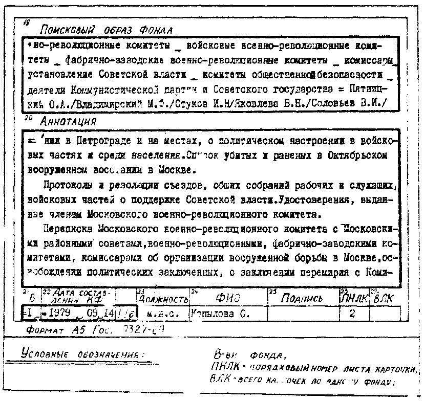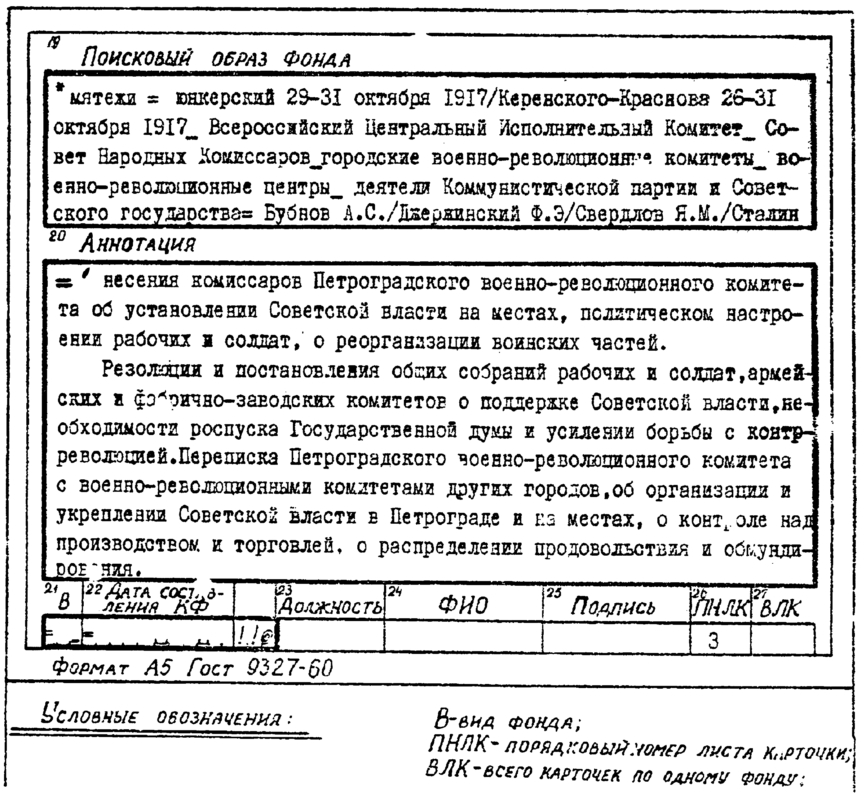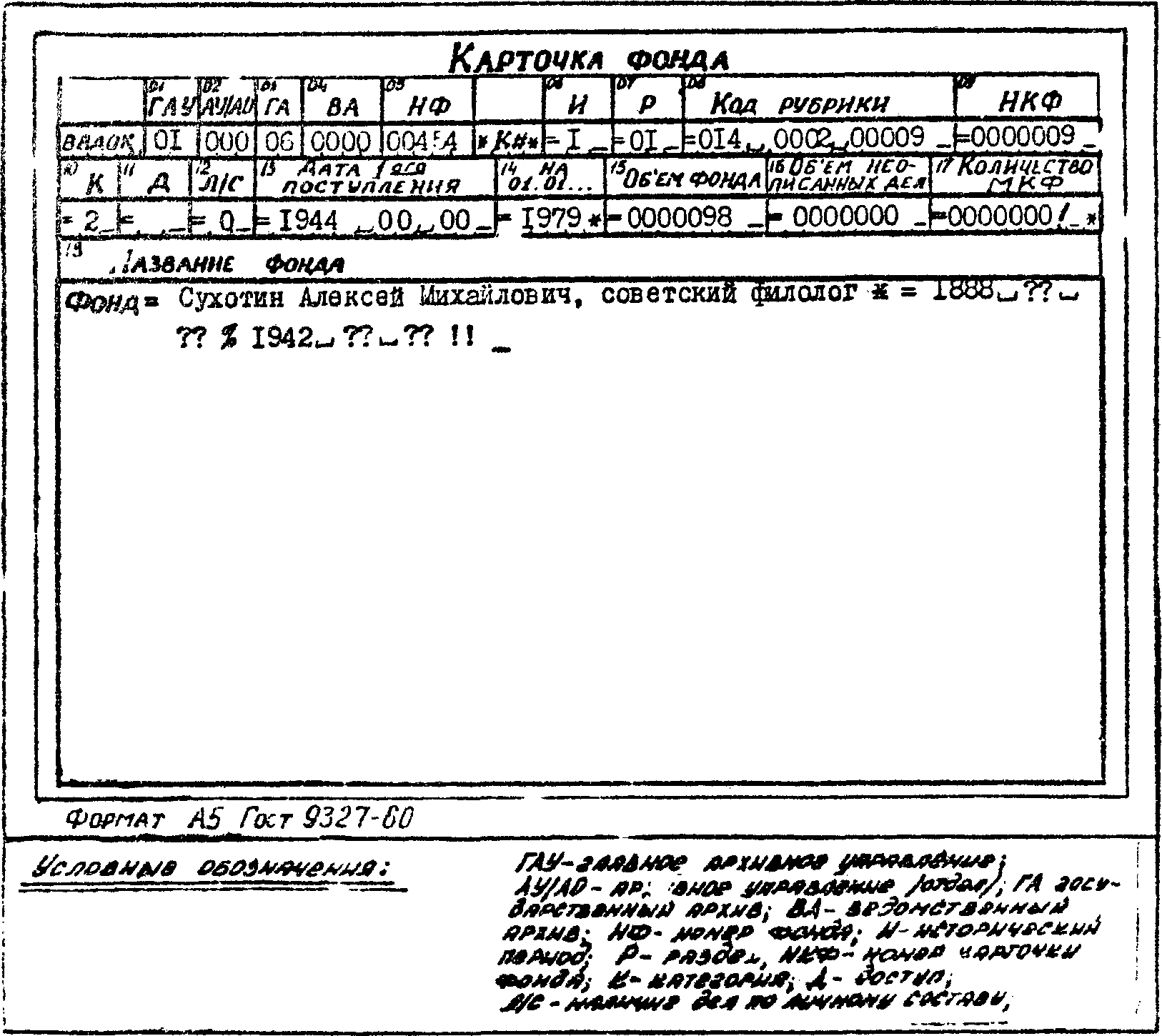 2.3.1. Карточка фонда содержит 27 реквизитов и заполняется в два приема: децентрализованно - в ведомственных и государственных архивах и централизованно - в соответствующих подразделениях АСНТИ по документам ГАФ СССР.