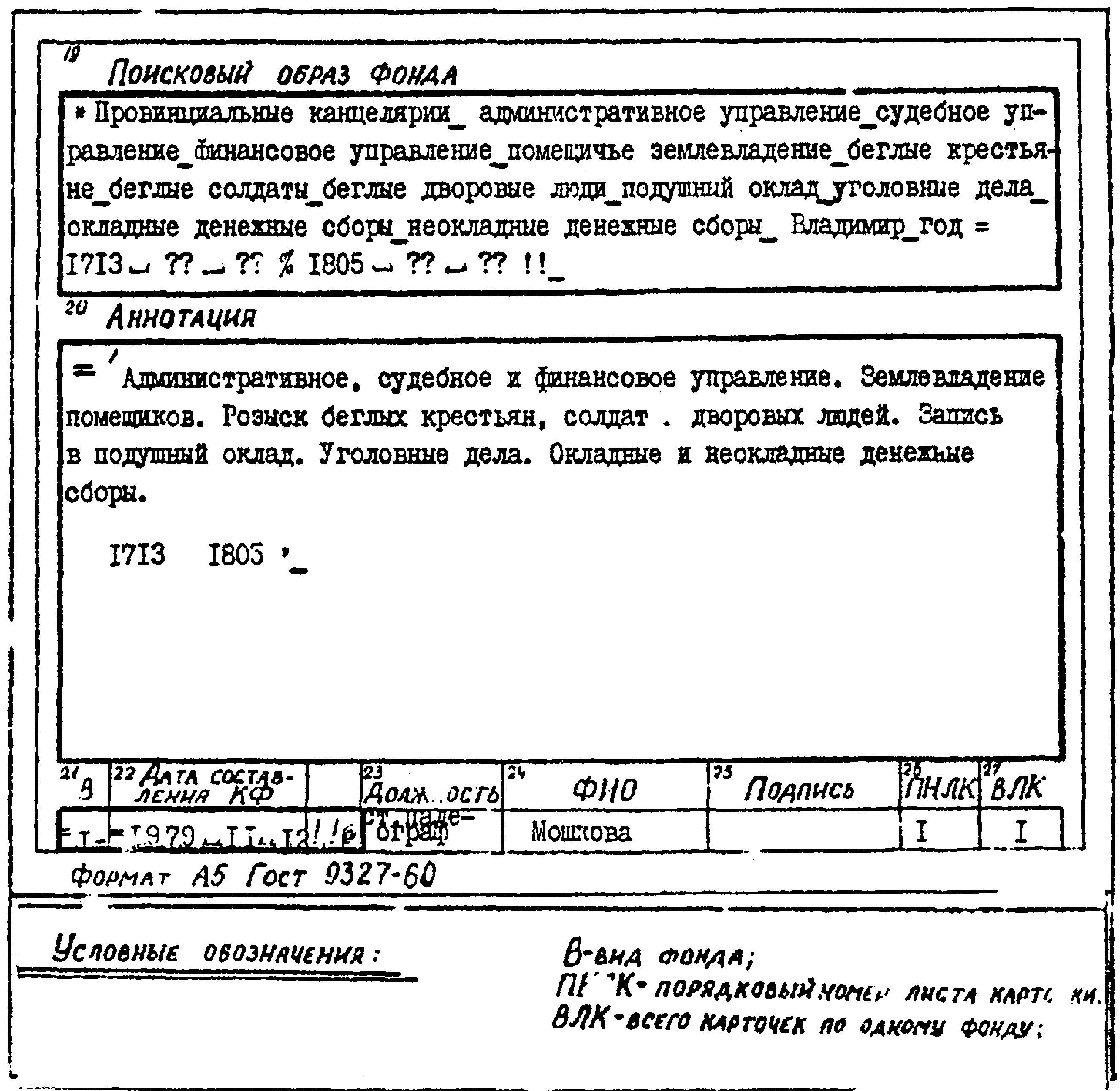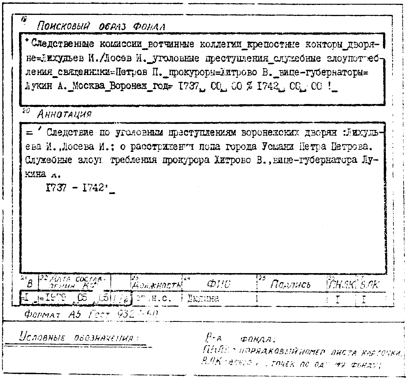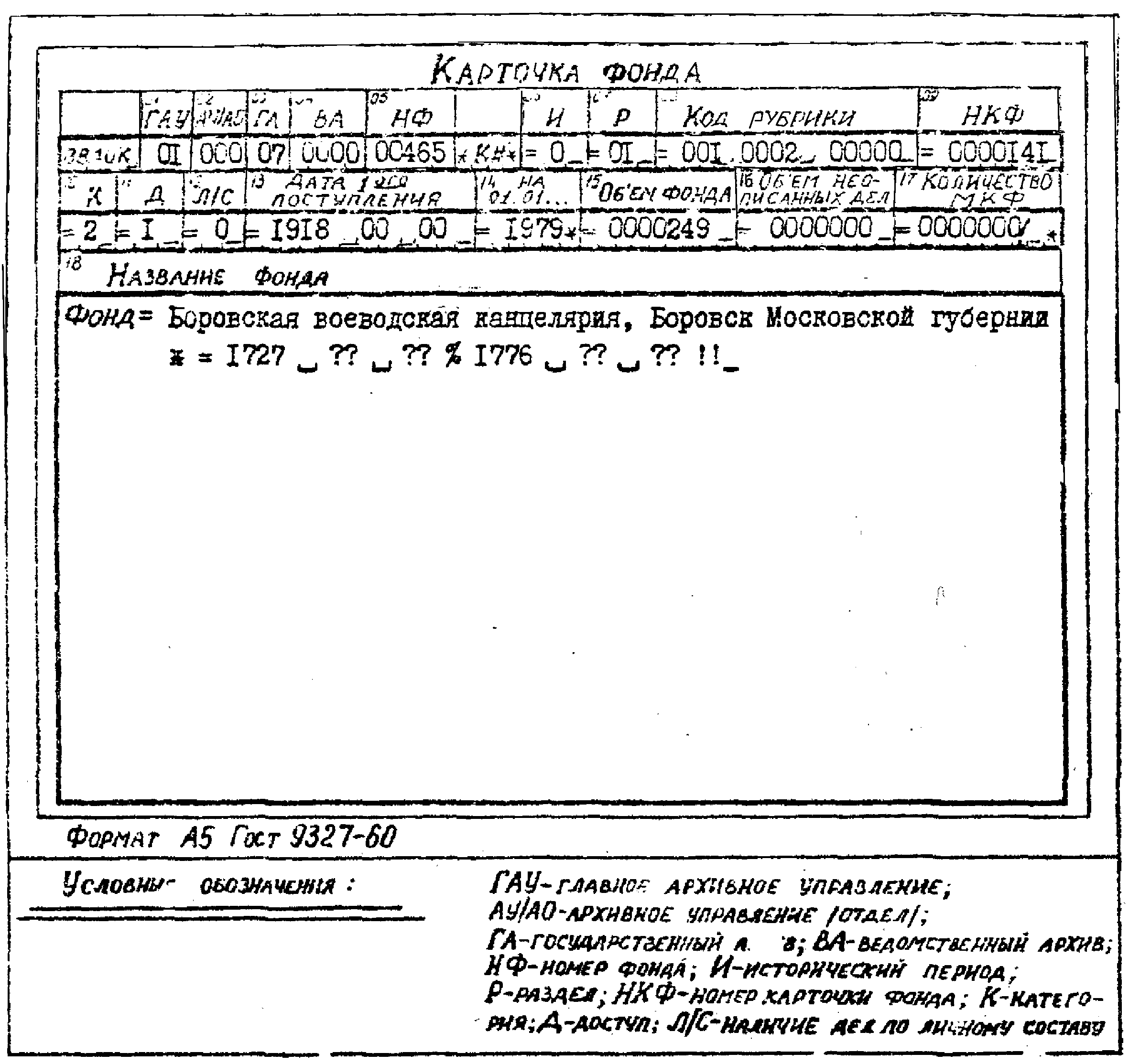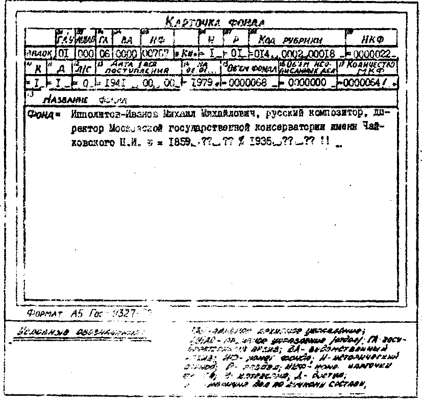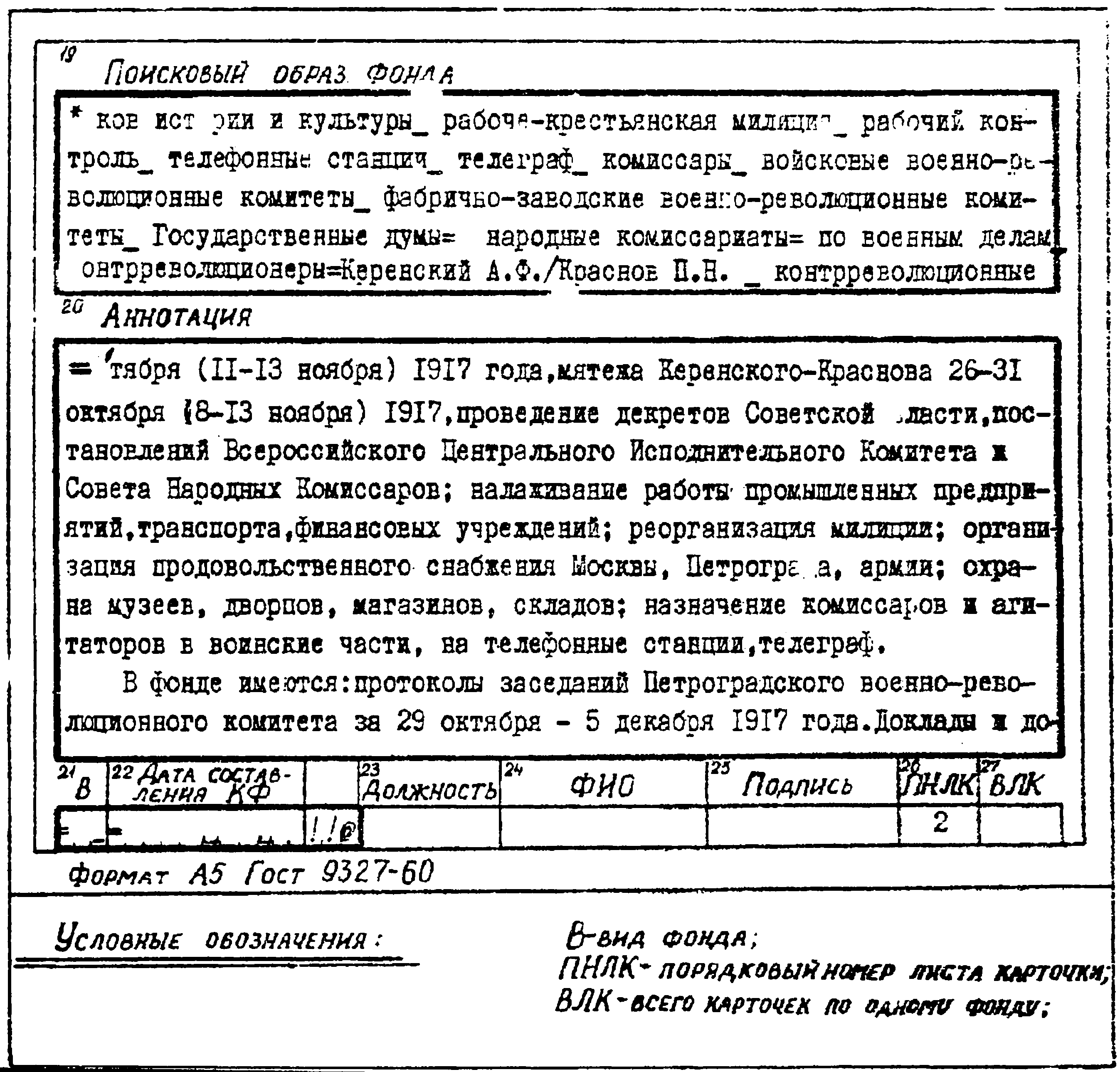 2.3.1. Карточка фонда содержит 27 реквизитов и заполняется в два приема: децентрализованно - в ведомственных и государственных архивах и централизованно - в соответствующих подразделениях АСНТИ по документам ГАФ СССР.