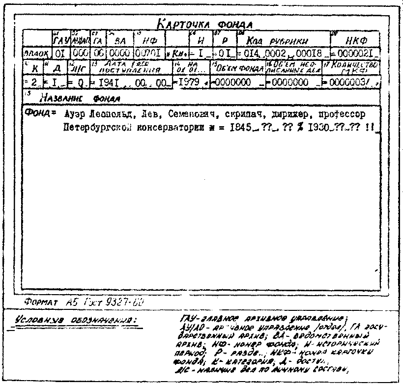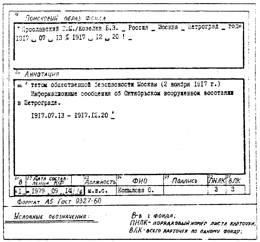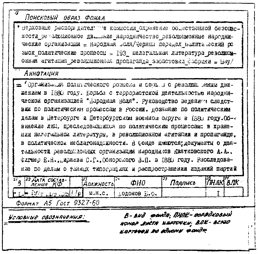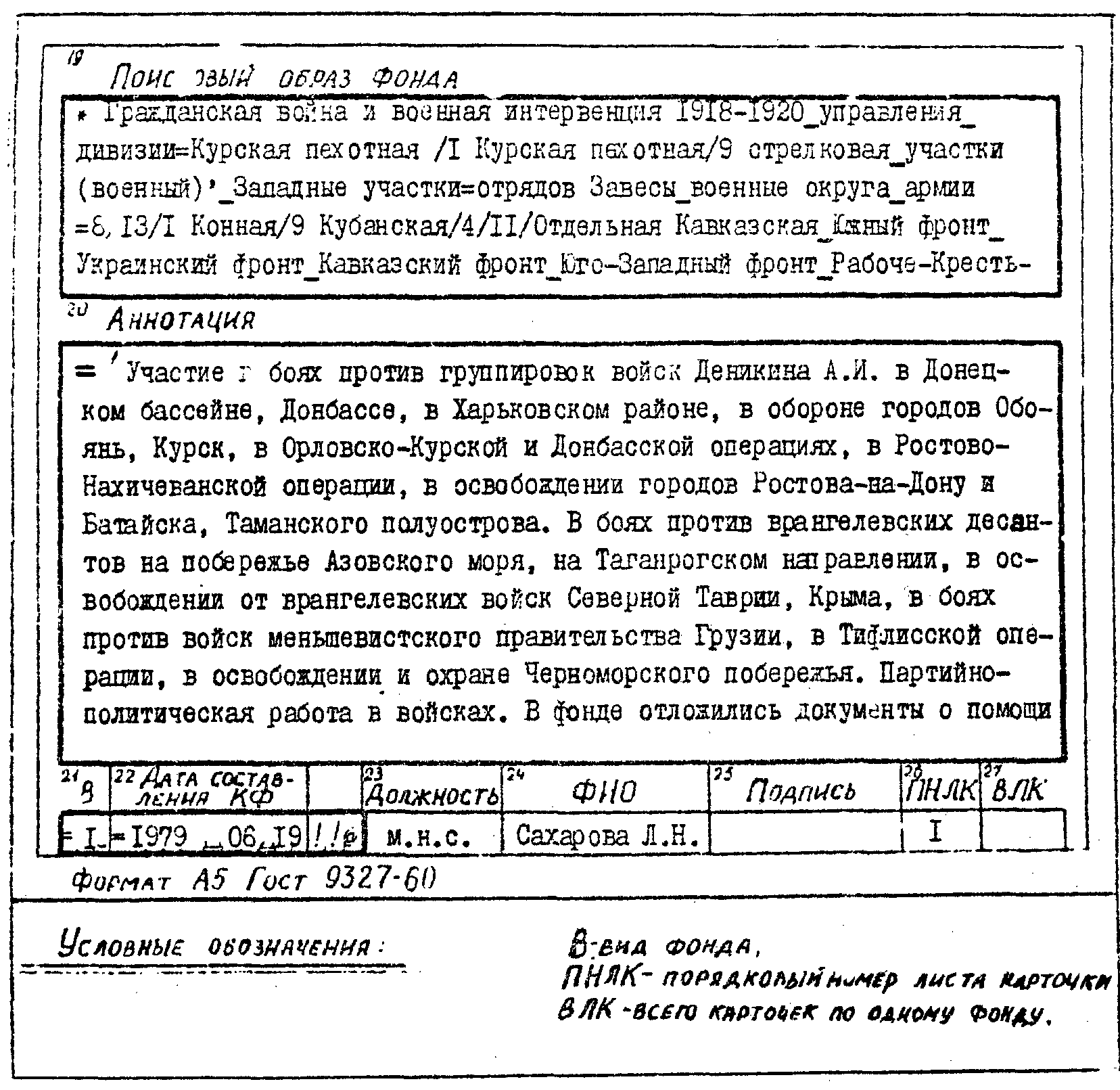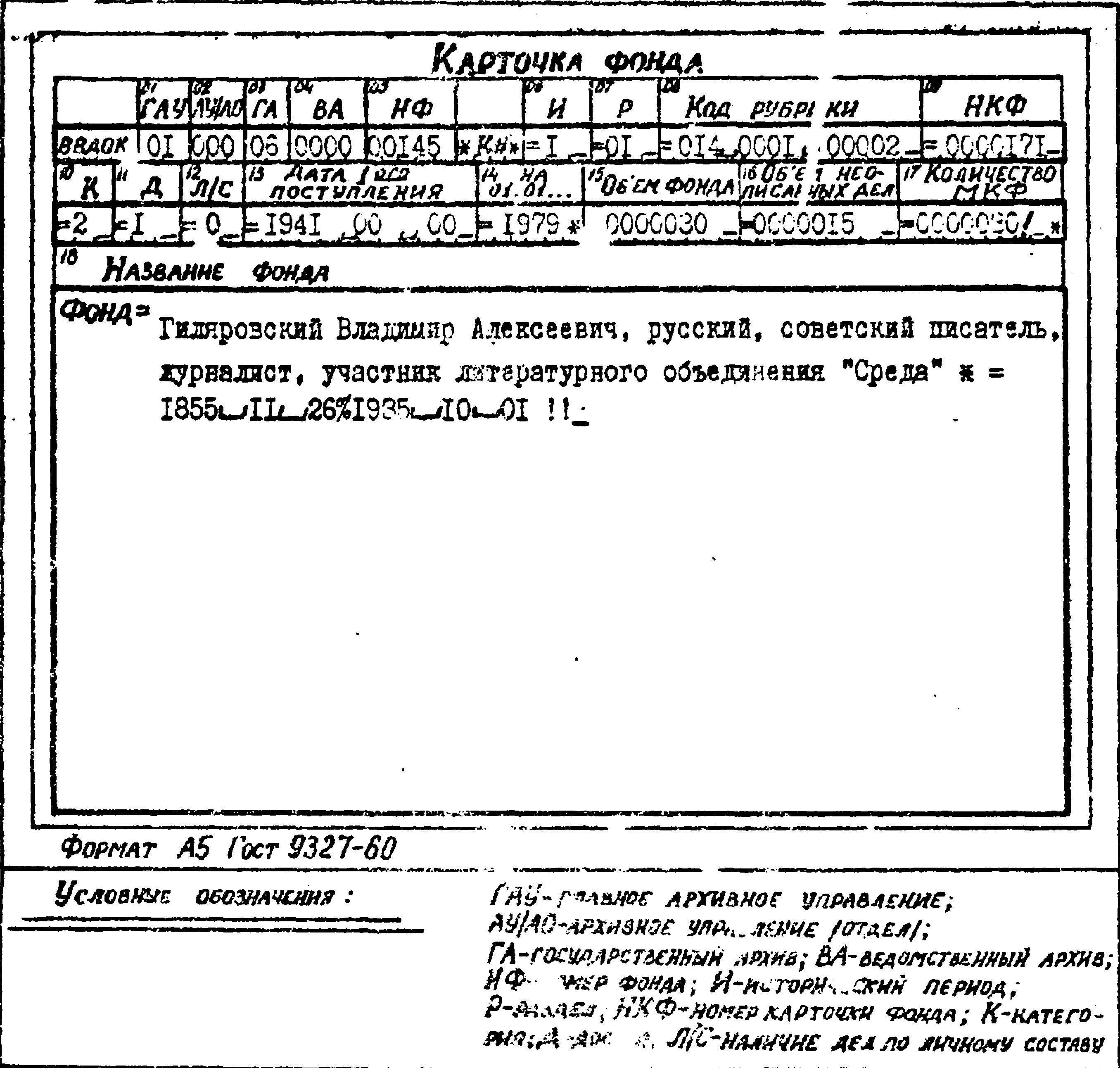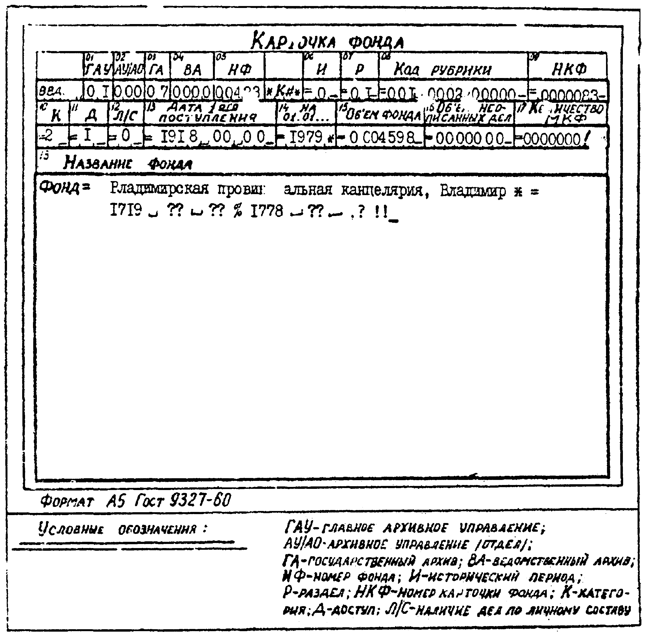 2.3.1. Карточка фонда содержит 27 реквизитов и заполняется в два приема: децентрализованно - в ведомственных и государственных архивах и централизованно - в соответствующих подразделениях АСНТИ по документам ГАФ СССР.