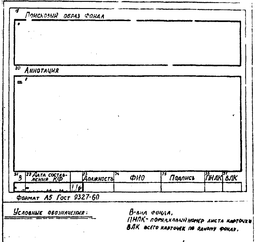 ГОСТ 9327-60. Качество бумаги должно соответствовать ГОСТ 9035-73. При изготовлении карточки фонда должны использоваться типографские шрифты, предусмотренные ГОСТ 3489.2-71 и ГОСТ 3489.6-71. Форма карточки фонда дана в