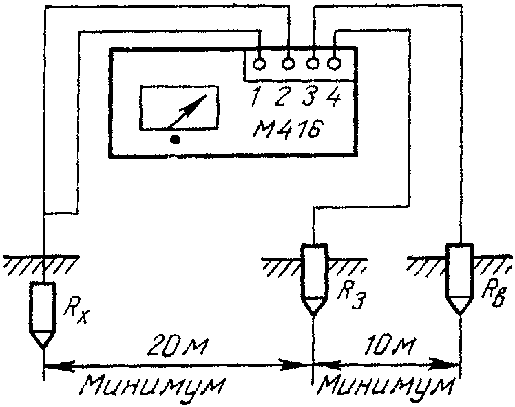 x с зажимами 1, 2. Стержни, образующие вспомогательный заземлитель и потенциальный электрод (зонд), устанавливаются на расстояниях, указанных на рис. 1 -