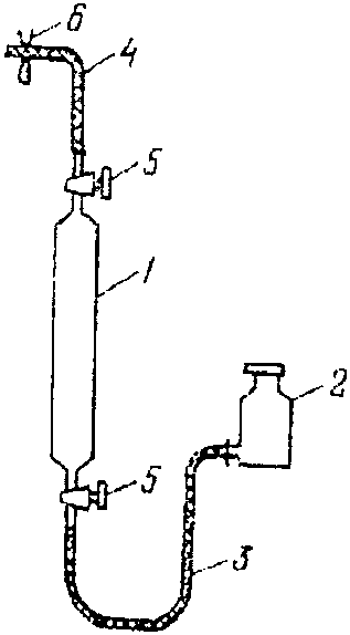 3. Калиброванную пипетку 4 заполняют затворной жидкостью, соединяют с краном 3 резиновой трубкой. Опускают склянку 5 до уровня нижнего крана пипетки и открывают оба крана.