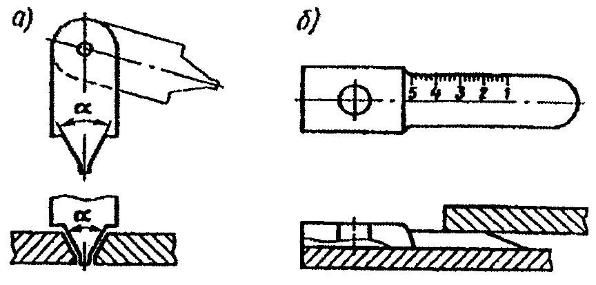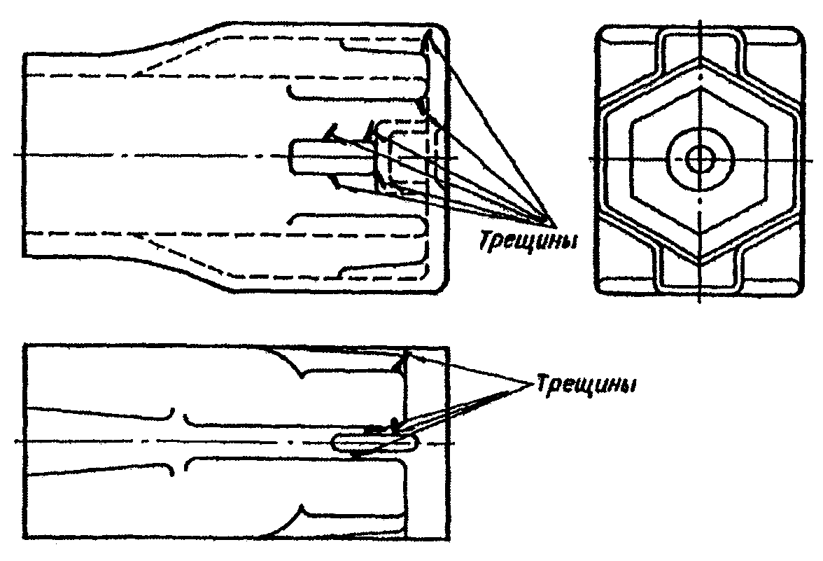 1.3.8. Разделку несквозных трещин следует выполнять на всю глубину до целого металла и по длине на 15 - 20 мм далее видимых границ трещины. При разделке сквозных трещин концы ее должны быть засверлены сверлами диаметром 6 - 12 мм и раззенкованы на 1/2 - 1/3 толщины металла.