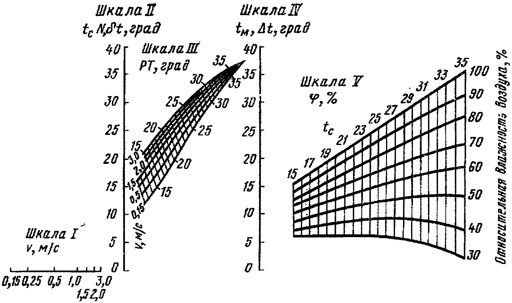 , а на шкале I - точку, соответствующую скорости движения воздуха. Соединяют эти две точки прямой и в месте пересечения этой прямой со шкалой II определяют поправку на тепловую радиацию