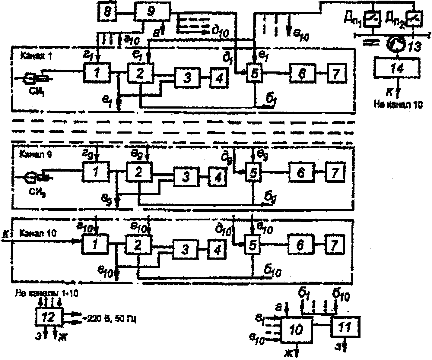 Все каналы блока регистрации, контроллер 10 и промежуточный носитель информации 11 получают питание от стабилизированного источника питания 12, с которого (выходы з, ж) подается различное напряжение.