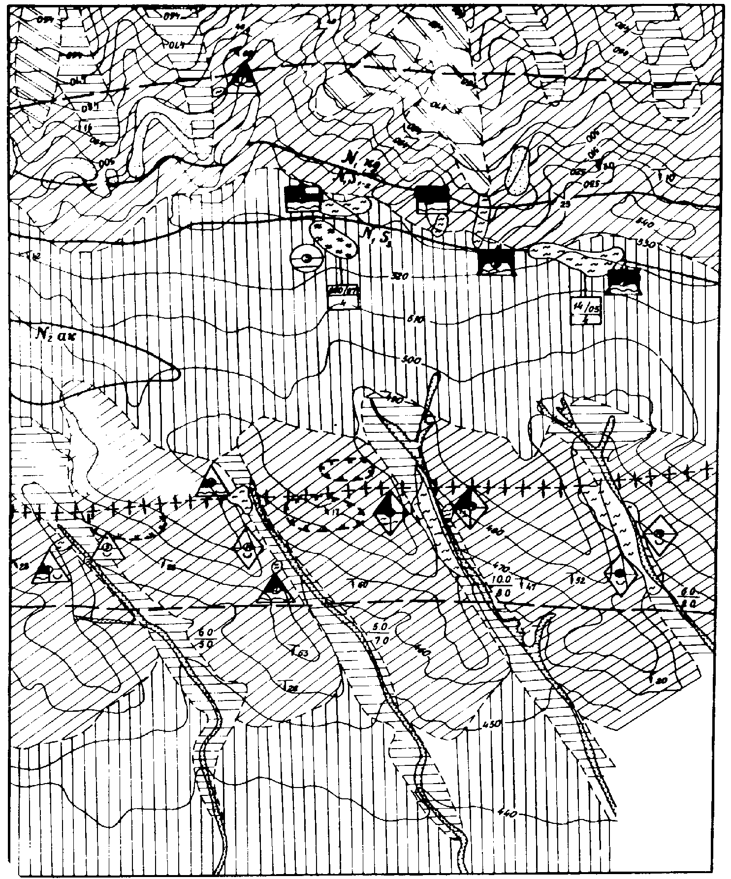 , представляют собой смещение пачек сарматских отложений по поверхности напластования и относятся к инженерно-геологическому типу "скольжения". Условным знаком