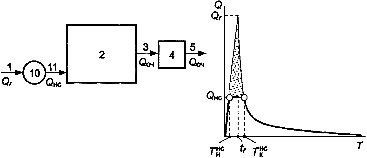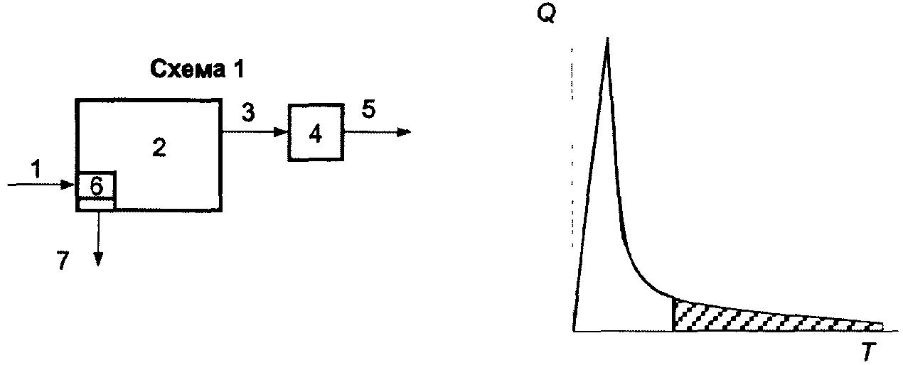 , при котором начинается перелив избыточного объема дождевого стока из разделительной камеры 6, определяется как момент времени, при котором объем дождевых стоков, поступивших в аккумулирующий резервуар из разделительной камеры 8, равен объему очищаемых стоков от расчетного дождя