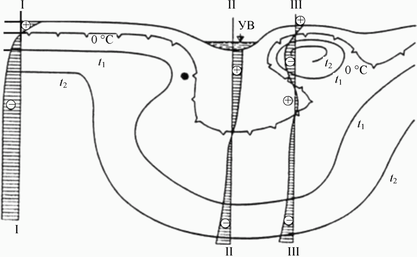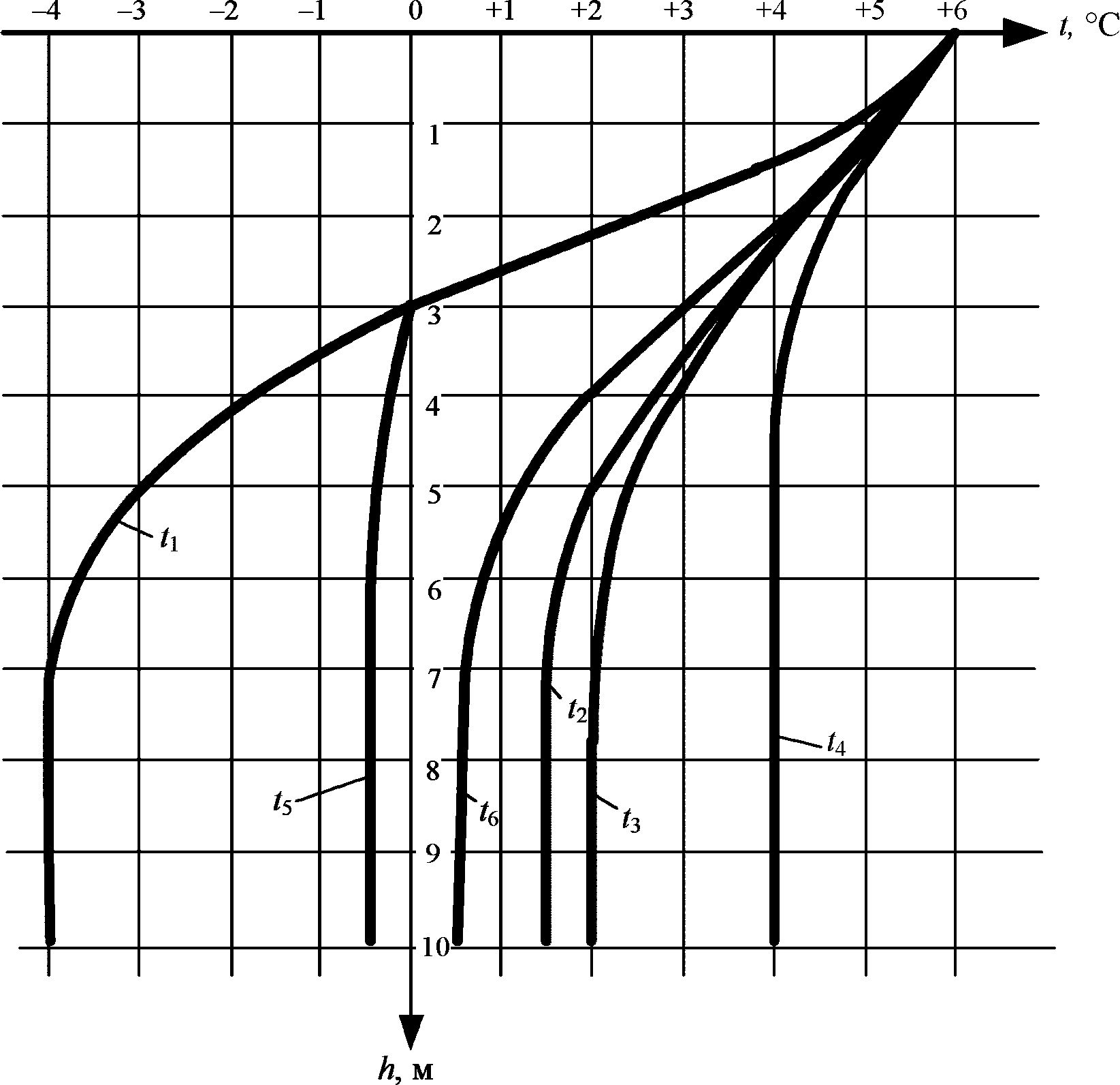 P (таблица К.3) или на основании натурных данных строят эпюру распределения температуры грунта по глубине в условиях полной изолированности данной зоны от соседних. Эпюры приведены на