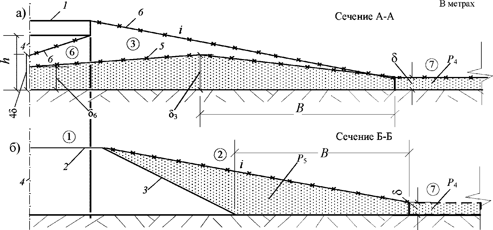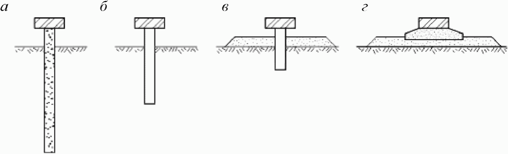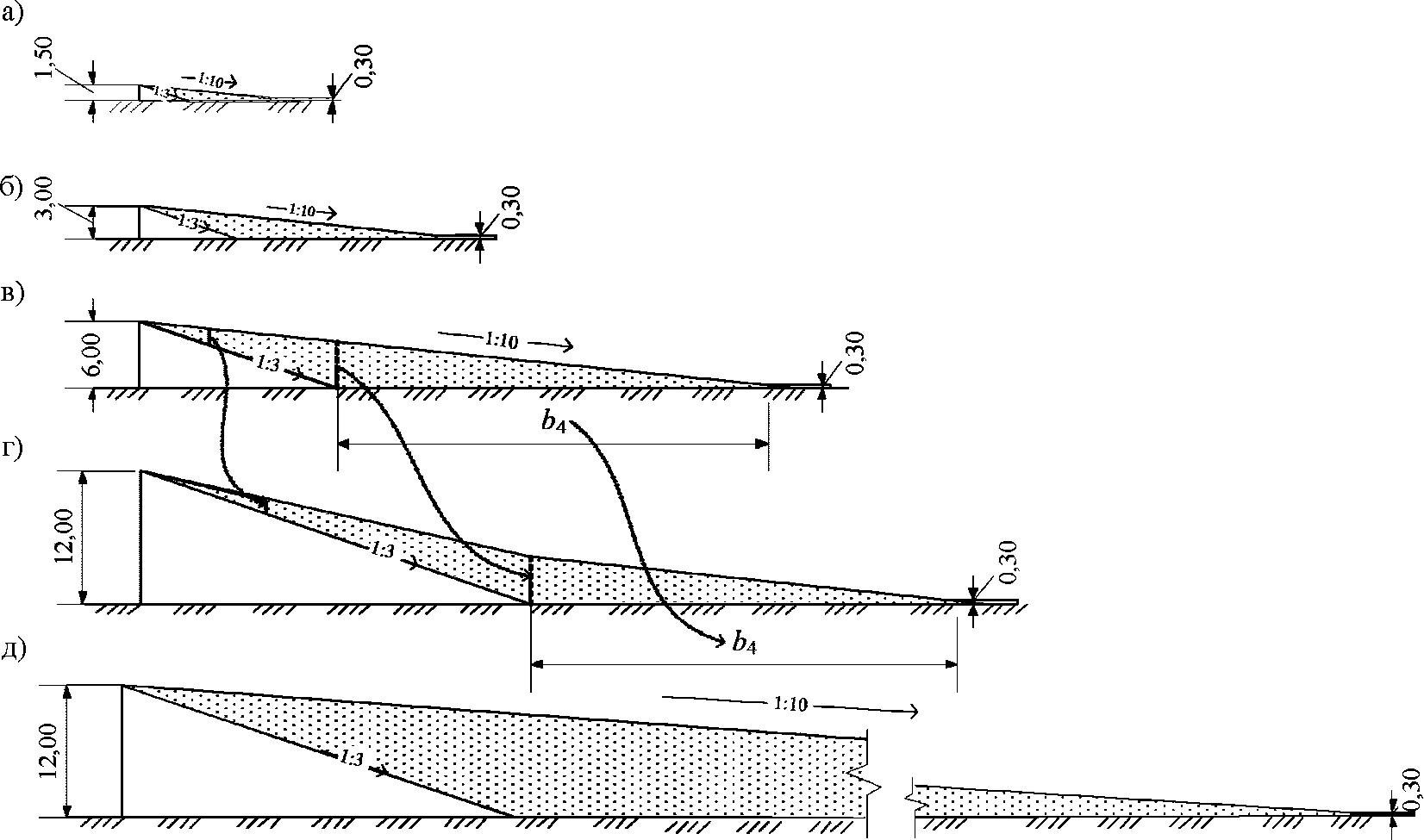 а, б, в, г - для насыпей с высотой 1,5; 3,0; 6,0;