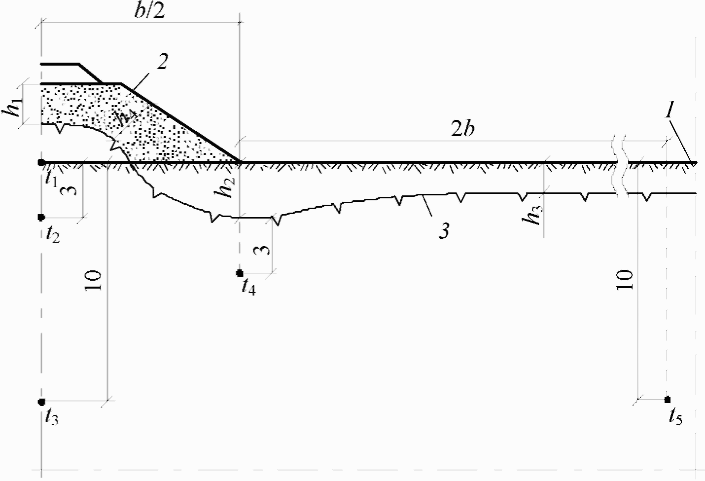 t по глубине основания в пределах любой зоны перехода через водоток, суммируя эпюры отдельных зон. Для этого на плане перехода намечают точку О