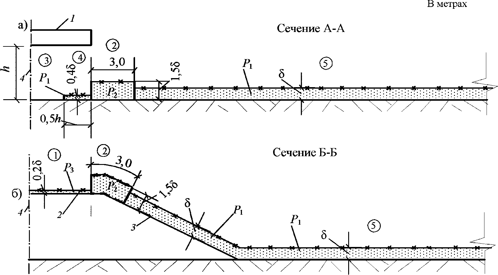 в точке О (задняя грань устоя) на глубине 3 и 5 м