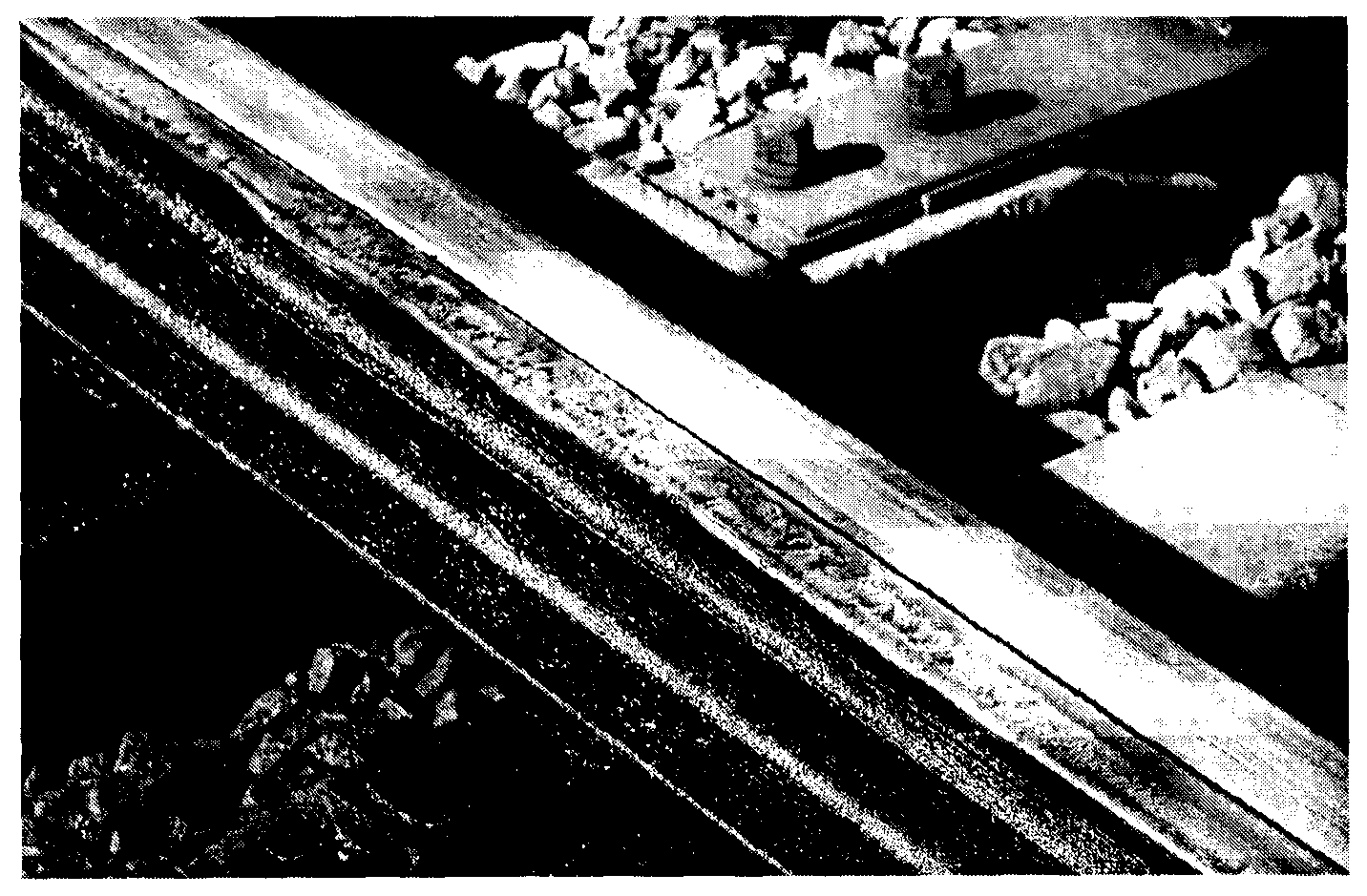 ![]() | Смятие головки рельса в виде седловины против зоны перекатывания колес с усовика на сердечник и обратно | Расположение и обозначение: |