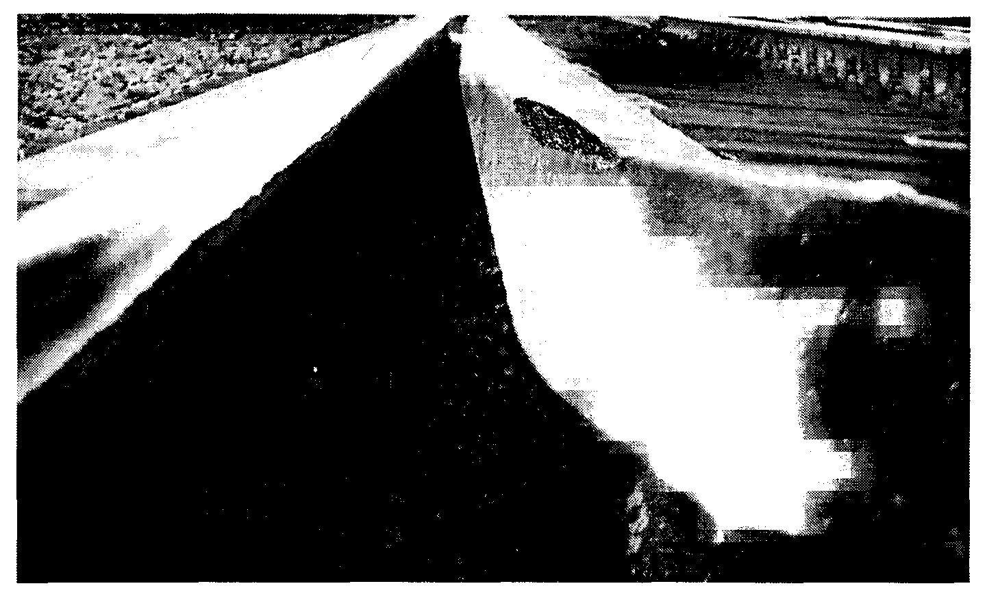 Гребнеобразный наплыв, образующийся на остряке в зоне боковой строжки из-за недостаточной прочности металла, выкрашивается при взаимных перемещениях остряка и рамного рельса под воздействием колес подвижного состава при несвоевременном его удалении шлифованием. | ||