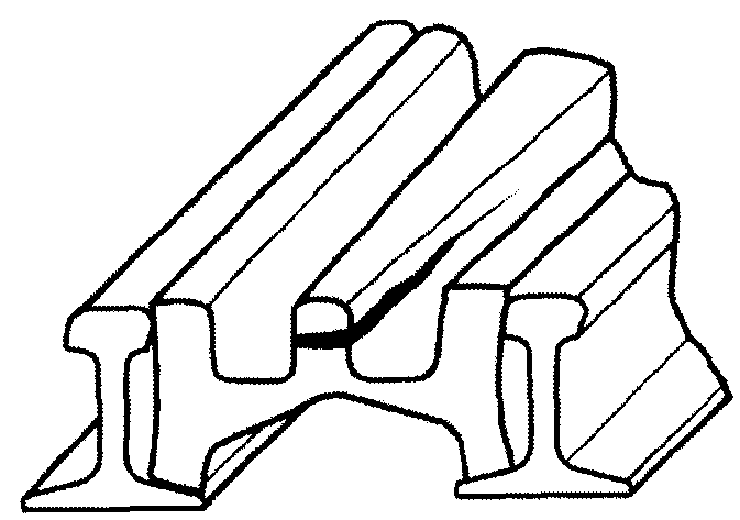 ![]() | Поперечные трещины в головке контррельса из спецпрофиля РК и изломы из-за них вследствие повышенного бокового воздействия колес | Расположение и обозначение: |