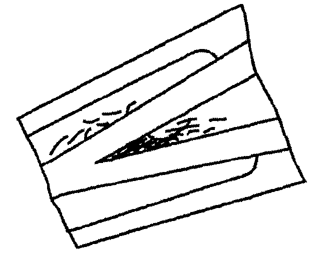 ![]() | Выкрашивание гребнеобразного наплыва в сторону рамного рельса в зоне боковой строжки остряка из-за недостаточной контактно-усталостной прочности металла | Расположение и обозначение: |