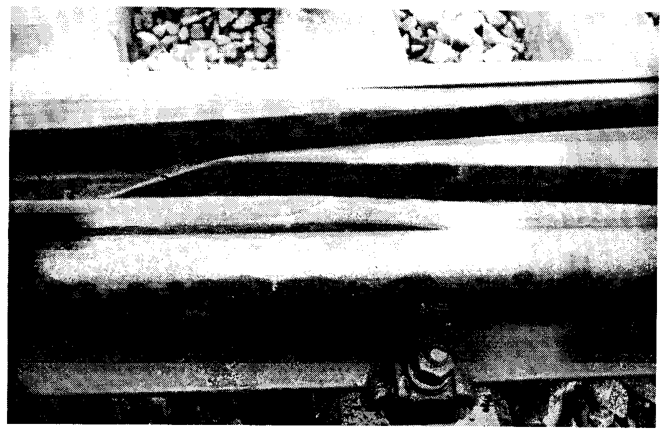 Трещины в подошве из-за наличия дефектов в литье, а также заусенцев и ступенек после фрезерования верха подошвы хвостовой части сердечника | В стыке | ||