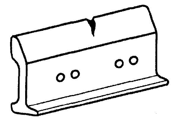 ![]() | Трещины от болтовых отверстий в контррельсе из спецпрофиля РК и изломы из-за них вследствие повышенного бокового воздействия колес | Расположение и обозначение: |