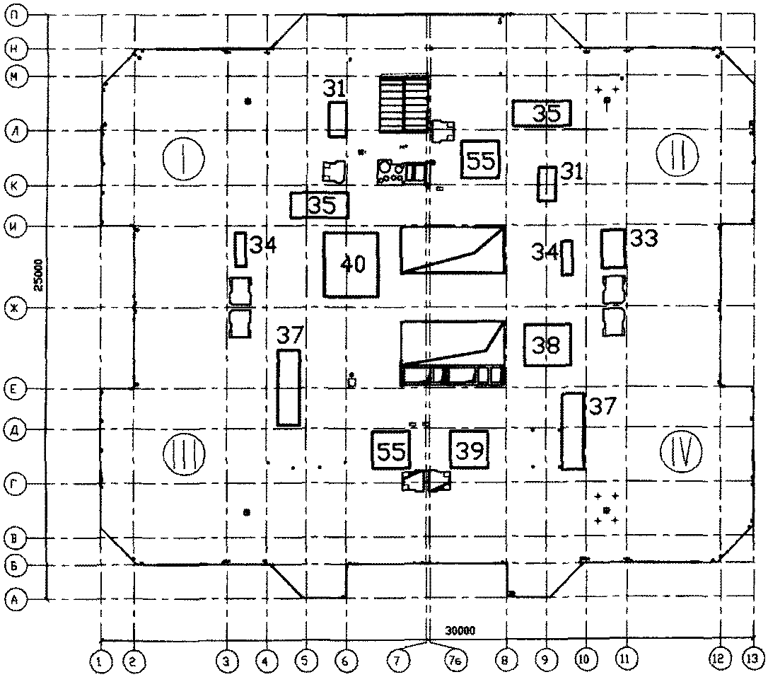 рис. 6 показан один из вариантов расстановки контейнеров и инвентаря на перекрытии типового этажа. Римскими цифрами обозначены захватки I, II, III и IV монтажных работ. Арабскими цифрами обозначены контейнеры и инвентарь, приведенные в