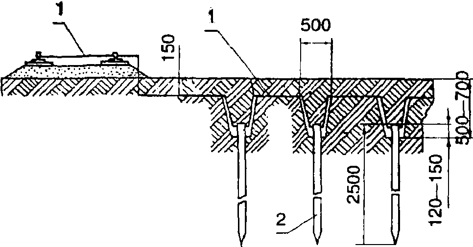 Железобетонная балка БРП-62.8.3 конструкции ЗАО "ЦНИИОМТП" (проект N 1977.10.100) для рельсового пути с нагрузкой от колеса на рельс до 331 кН (32,5 тс) имеет на верхней плоскости пять опорных плит для укладки и закрепления рельсов (