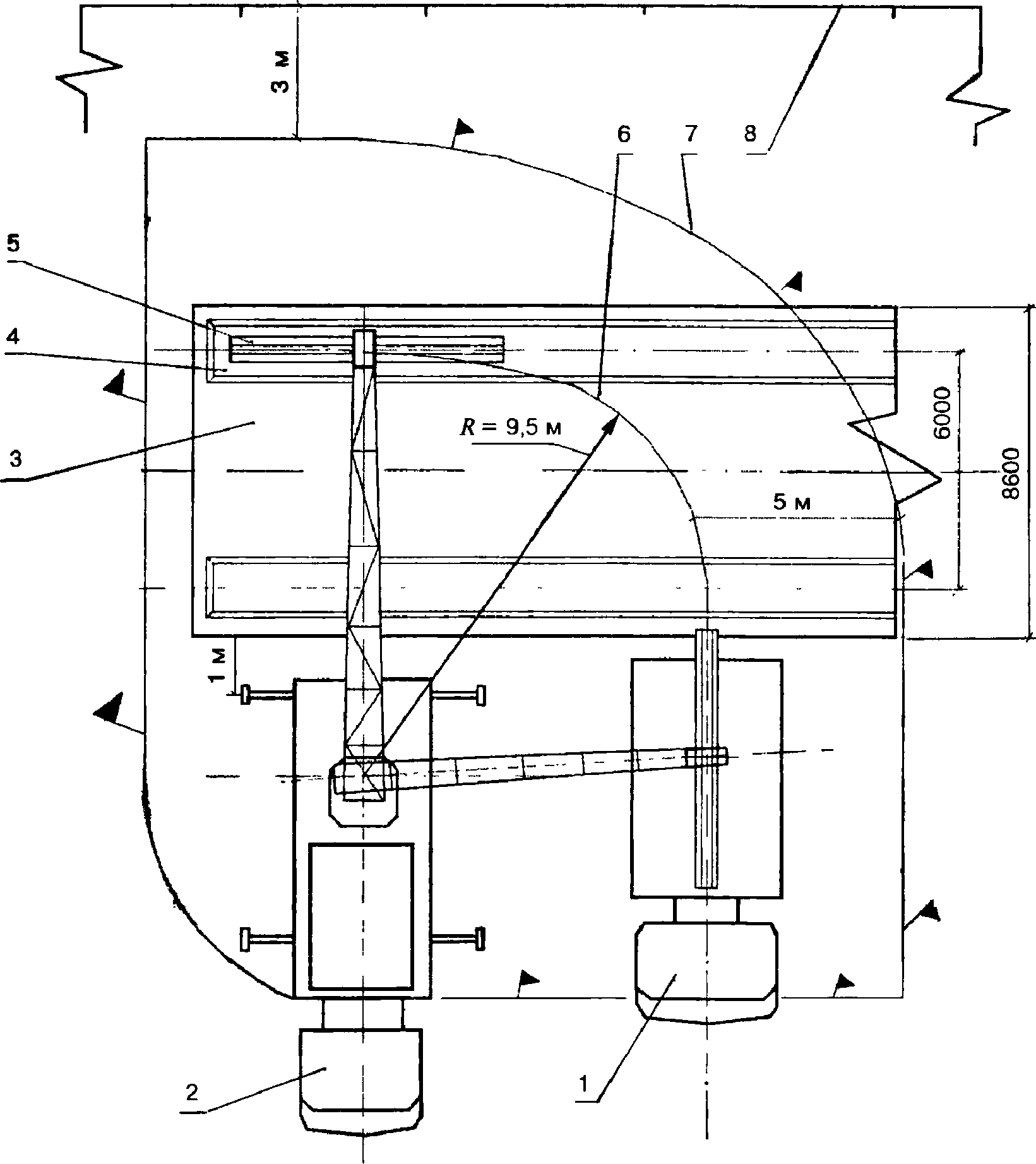 Кран находится при этом на стоянке начала работ. Кран перемещает в проектное положение балку с транспортного средства 1. Граница зоны обслуживания краном 6 определяется радиусом R = 9,5 м и поворотом стрелы на угол не более 90°. Высота подъема балки с транспортного средства и, следовательно, возможного ее падения не должна превышать 2 м. Граница потенциально опасной зоны крана при указанных выше габаритах балки (см.