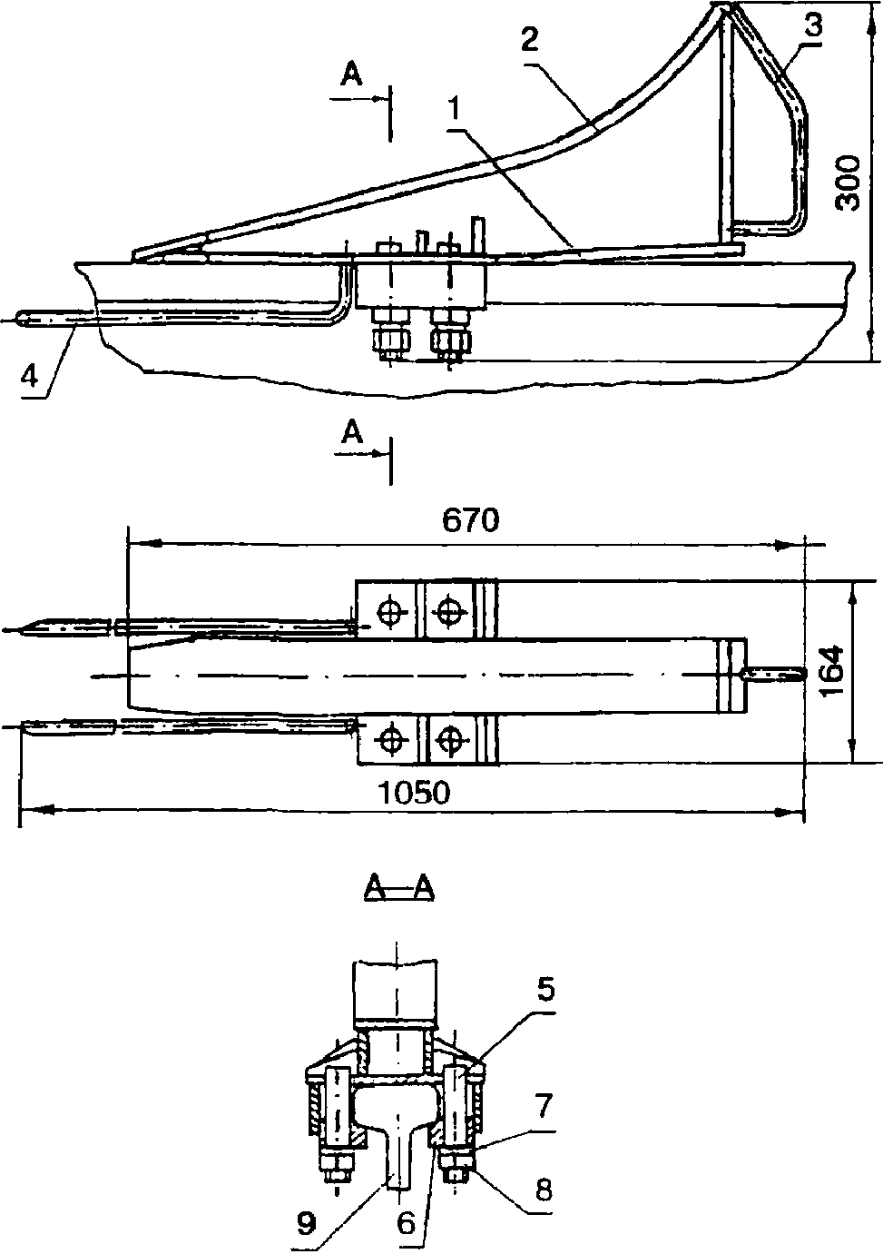 рисунке 5. Безударный тупиковый упор, имеющий основание 1, наклонную направляющую 2 и разводку 4, устанавливается на рельс с помощью рукоятки 3. Прижимные пластины 6 и шайбы 7 надеваются на шпильки 5 упора и затягиваются гайкой 8 с помощью динамометрического ключа, при этом соблюдается усилие затяжки, указанное в проекте пути.