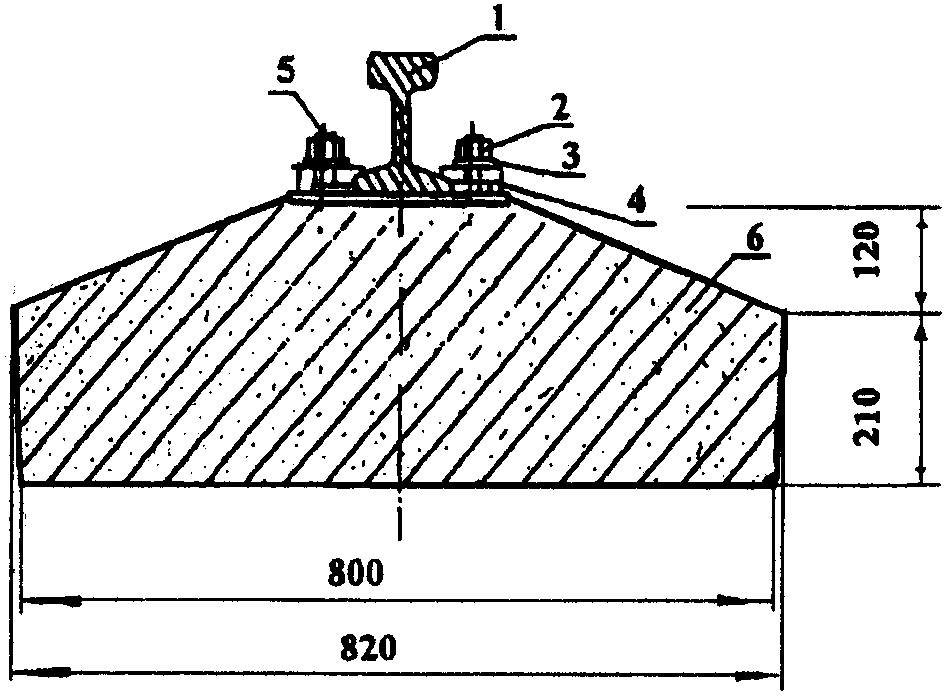 В состав нижнего строения входит земляное полотно 1 шириной 8,6 м с водоотводной канавой 2. В состав верхнего строения входят балластный слой 3, железобетонные балки БРП-62.8.3 4, на которые уложены рельсы типа Р65 5 по