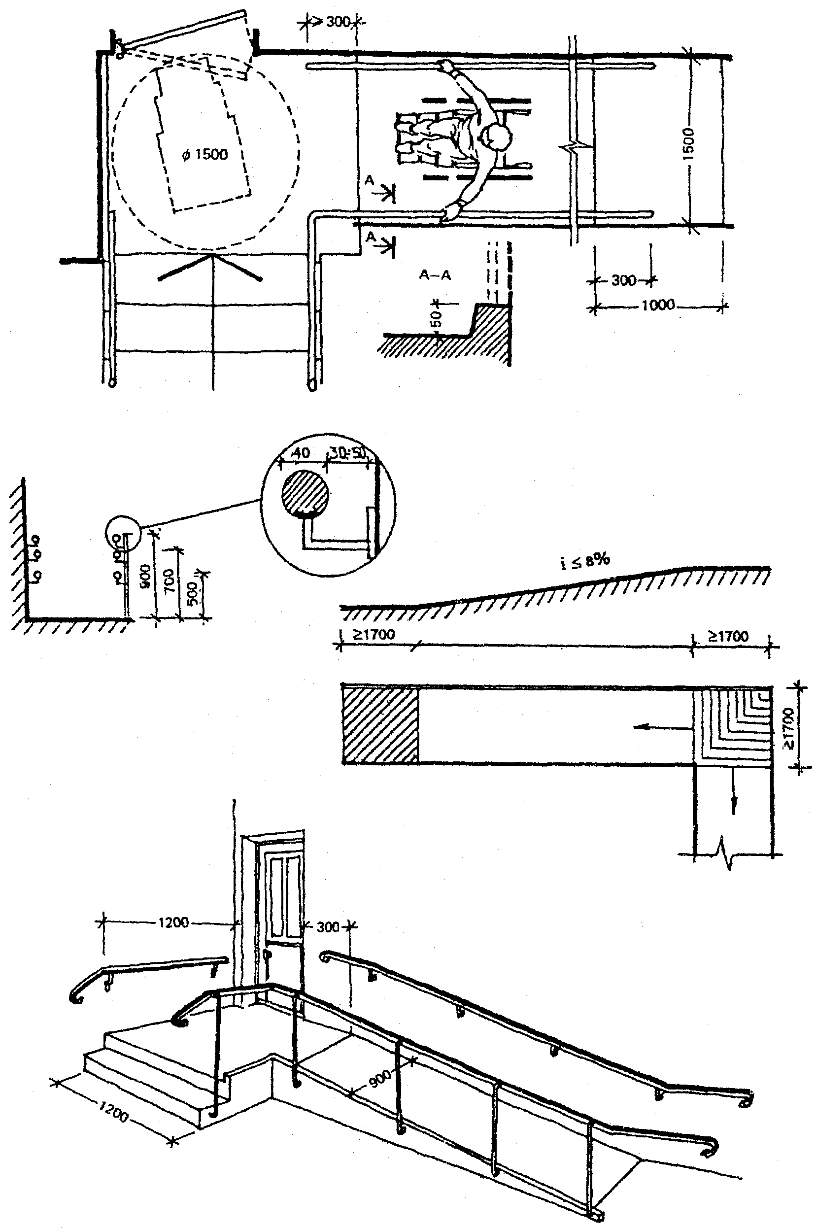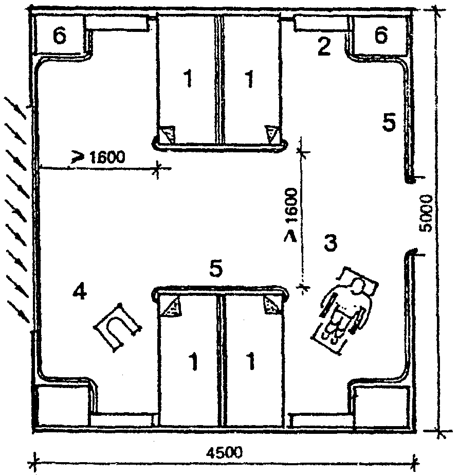 Ширина внутренних проходов должна быть в свету не менее 1500 мм, причем открывающиеся двери, информирующие знаки, шкафы, скамьи и прочее не должны вторгаться в это минимальное свободное пространство.