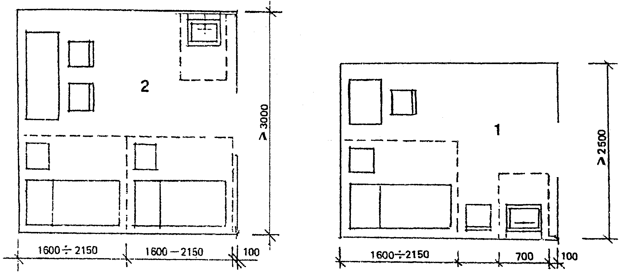 Предметы с острыми углами, выступающие из стен, не должны выступать более чем на 100 мм. Они также не должны уменьшать минимально необходимую ширину коридора.