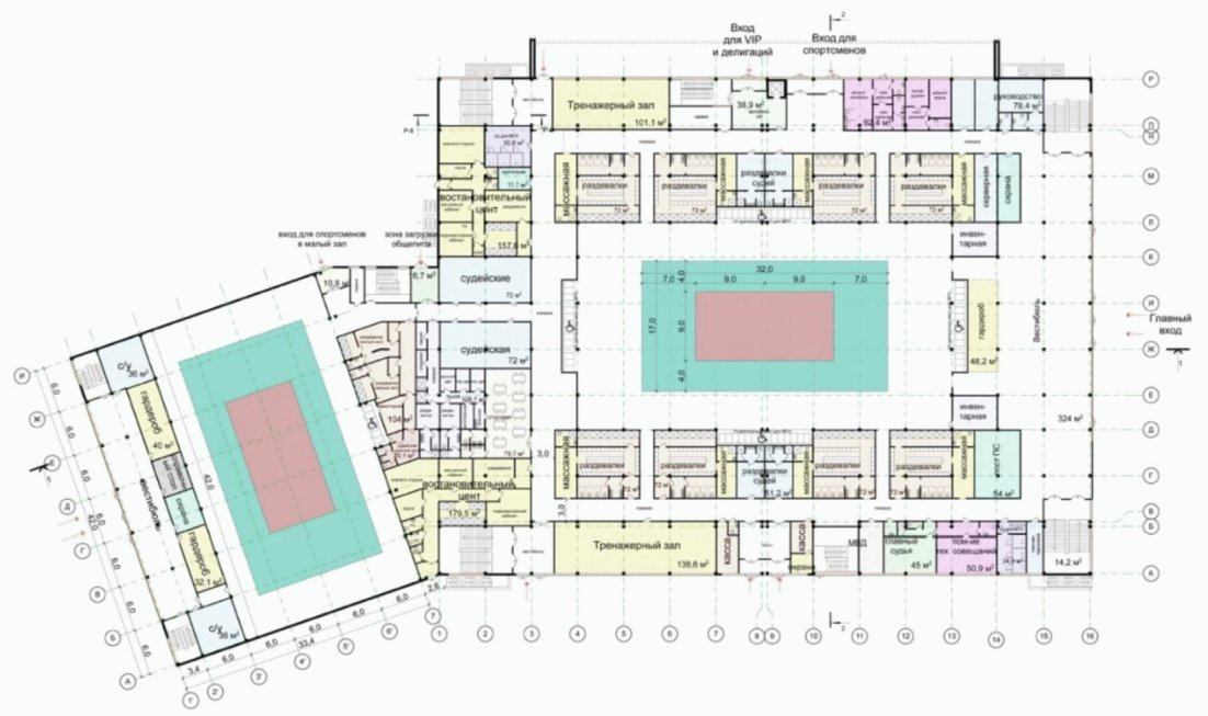 Спортивные комплексы со специализированными залами для определенного вида спорта, также предъявляют особые требования к проектированию. Пример объемно-планировочного решения специализированного комплекса с залами для волейбола представлен на