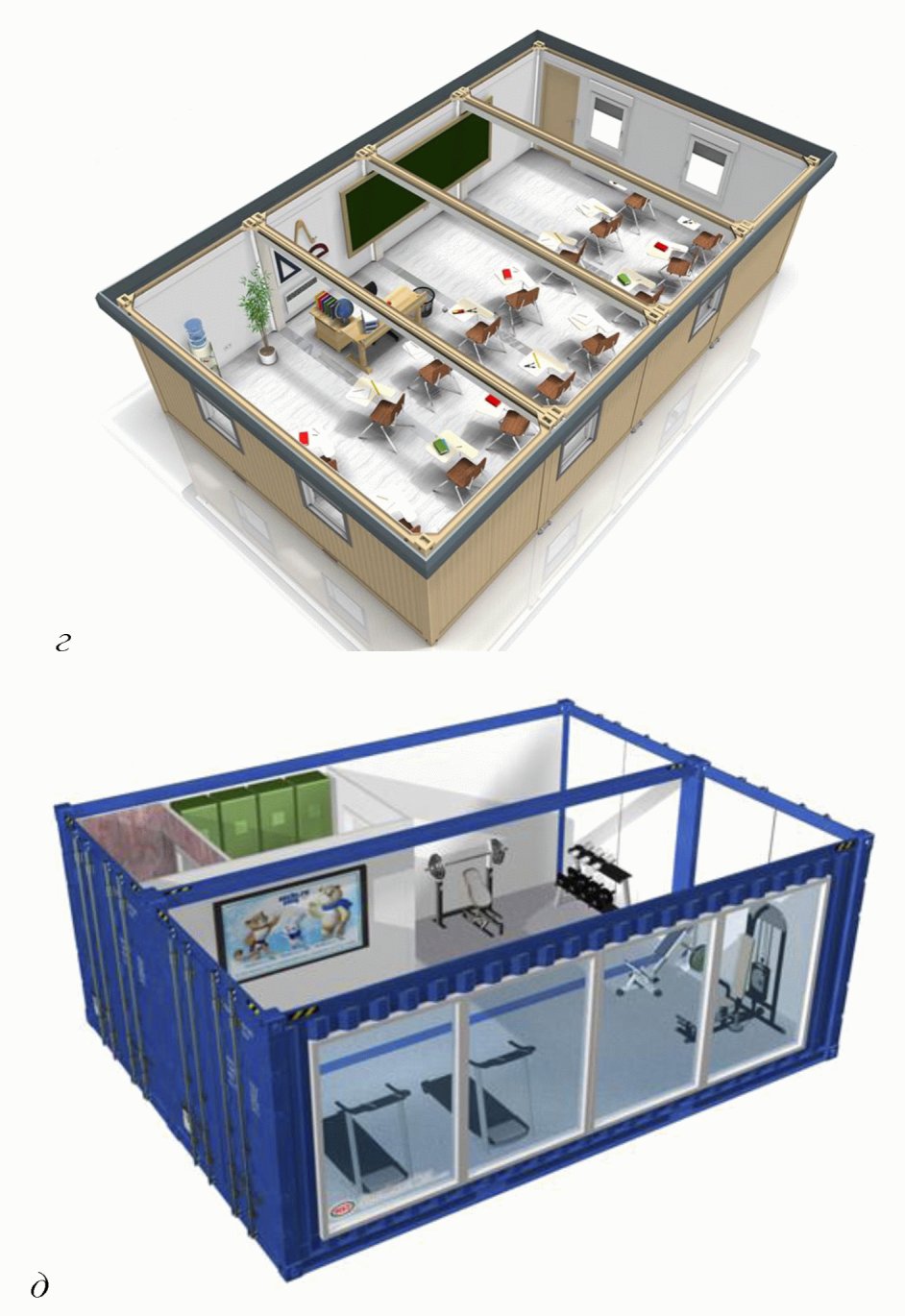 Примеры использования модулей под сушилку, инвентарные для уличных площадок, учебный класс и тренажерный зал приведены на