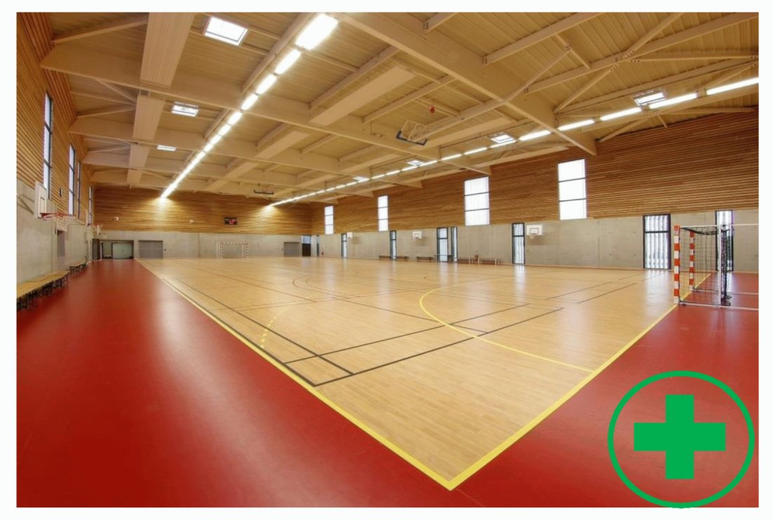 Для зальных игровых видов спорта (волейбол, баскетбол, мини-футбол, гандбол и пр.) существует четко прописанный размер зоны безопасности за пределами игровой разметки. Как правило, зона безопасности указывается в своем минимальном значении, и на практике применяется именно такой ее размер "не менее...". Однако, следует предусматривать, при проектировании залов или площадок для командных игровых видов спорта, увеличение зоны безопасности для соревновательных сооружений на 25% - 50% от указанного "минимального значения". Это позволит снизить травматизм при проведении мероприятий. Причем, чем более высокий уровень квалификации у игроков (более высокий уровень проводимых соревнований), тем больше должен быть запас свободного пространства зоны безопасности. Отрицательный и положительный примеры по реализации зоны безопасности в универсальном игровом зале приведены на
