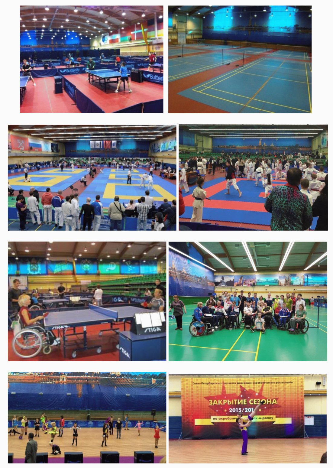 31. Типовой комплекс востребован для проведения соревнований, поскольку основная арена имеет зрительские места, а второй зал - разминочный. Основная арена размером 48 x 27 м; разминочная - 42 x 24 м; 4 500 зрителей; восемь командных раздевалок с массажными; тренажерные залы площадью 100 м