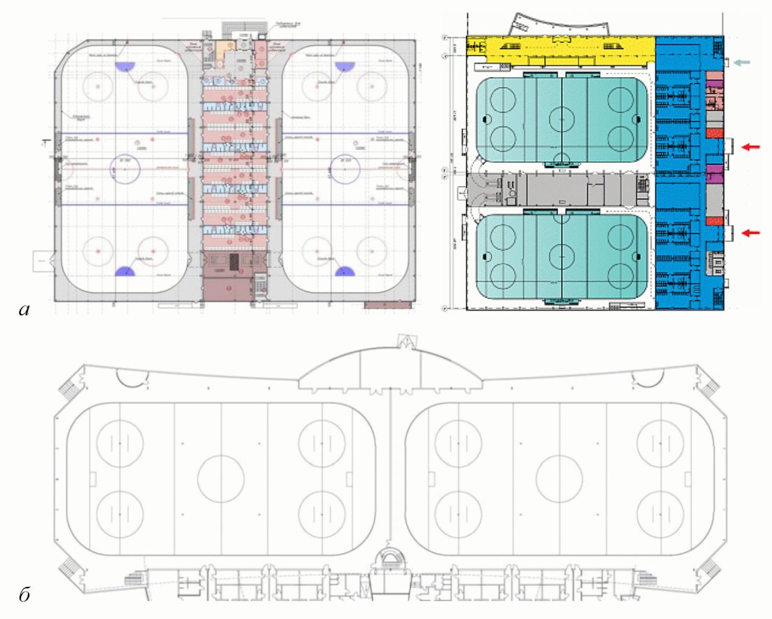 Пример компоновки двух ледовых арен различного функционального назначения приведен на