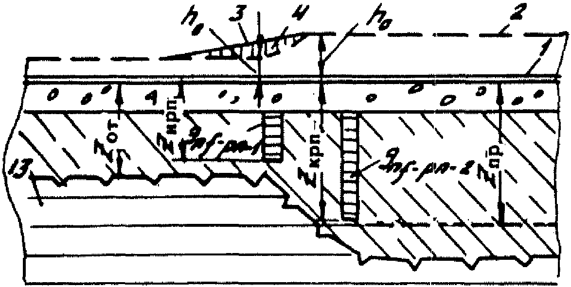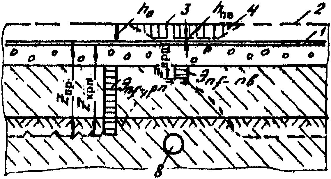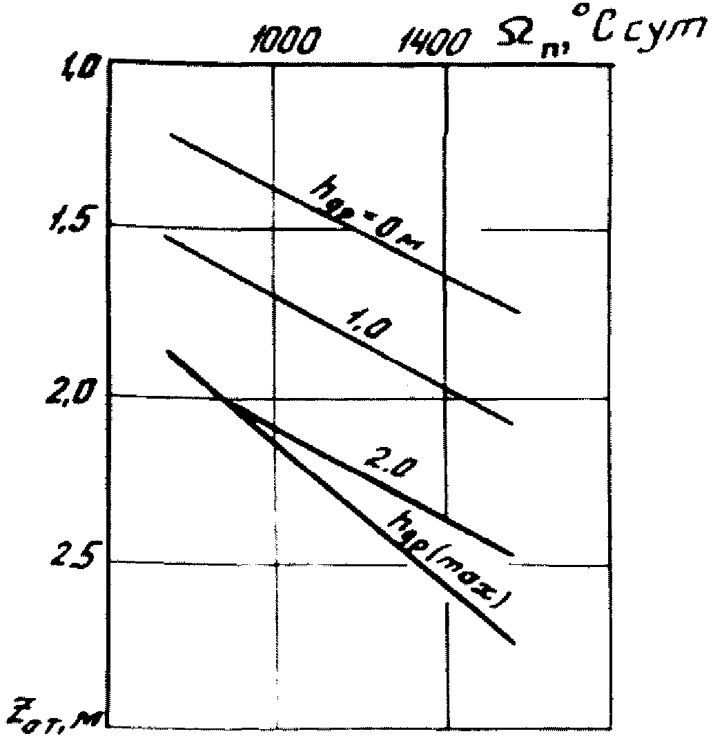 z пр, z от,  , z нрп, z крп | - глубина залегания от дневной поверхности соответственно границы промерзания, границы оттаивания, фронта промерзания, верхней границы слоя грунта, вызывающего неравномерность пучения (соответствующей началу роста пучины), нижней границы этого слоя (соответствующей прекращению роста пучины); |